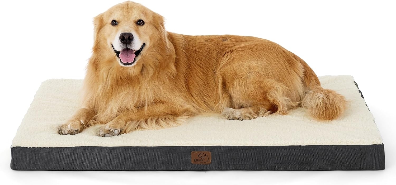 Das BEDSURE orthopädische Hundebett ist ideal für große Hunde bis 45 kg. Mit den Maßen 112 x 81 x 7,6 cm bietet es eine flauschige Liegefläche, die den Druck auf Gelenke und Knochen reduziert. Der spezielle EIKRATTENSCHAUM sorgt für optimale Stoßdämpfung und Komfort, während der rutschfeste Boden Stabilität gewährleistet. Der abnehmbare Bezug aus Leinenimitat ist pflegeleicht und passt perfekt in jedes Zuhause. **Highlights** - EIKRATTENSCHAUM für gleichmäßige Gewichtsverteilung und Druckentlastung - L-förmiger Reißverschluss für einfaches Waschen - Rutschfester Boden mit Gummipunkten für Stabilität - Vielseitig einsetzbar für Hunde, Katzen und andere Haustiere unter 45 kg - Hochwertige Materialien für einen ruhigen Schlaf **Produkteigenschaften** - Maße (LxBxH): 112 x 81 x 7,6 cm - Flauschige Sherpa-Oberfläche für zusätzlichen Komfort - Bezug aus Leinenimitat, der nicht am Fell haftet - Trendiges Design mit cremefarbener Oberfläche und grauen Seiten