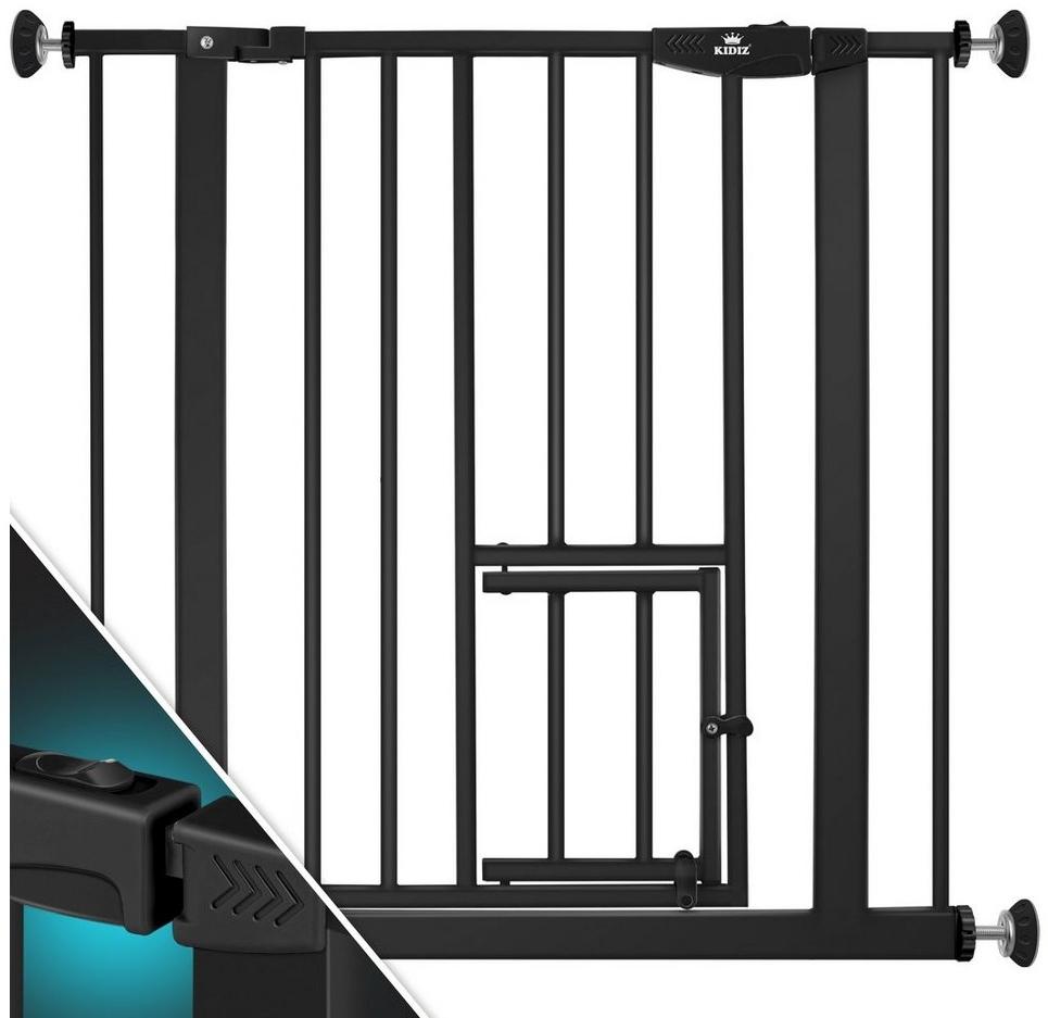 KIDIZ® Absperrgitter zum Klemmen mit KatzenklappeTürschutzgitter, Autoclose Kinder Treppengitter ohne Bohren | 90° Stopp Schutz, schwenkbar, Treppenschutzgitter Schwarz, 74 - 80 cm