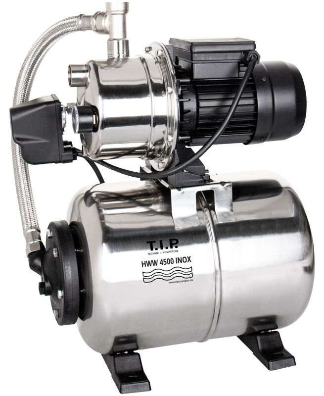 T.I.P. 31140 HWW 4500 INOX Hauswasserwerk Hauswasserpumpe 4.350 l/h Ansaughöhe 9 m Förderhöhe 50 m Förderdruck 5 bar 24 l Druckkessel
