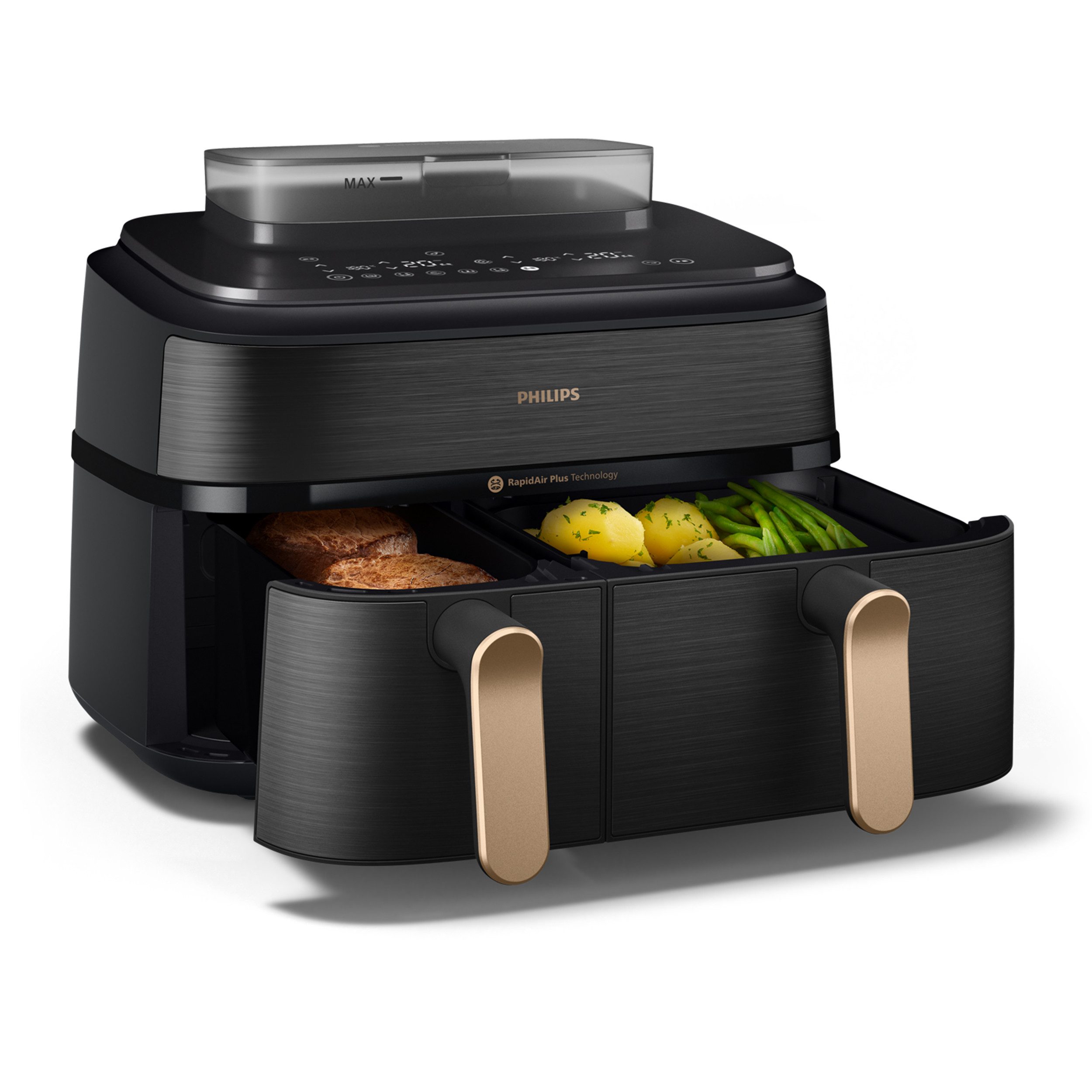 in HeißluftfritteusenPhilips Heißluftfritteuse 5000 Series NA552/00Dual Basket mit Steam und 9L Kapazität (6L+3L), 2750 W, RapidAir Plus Technologie, Dampfreinigung, HomeID App, Schwarz/Kupfer