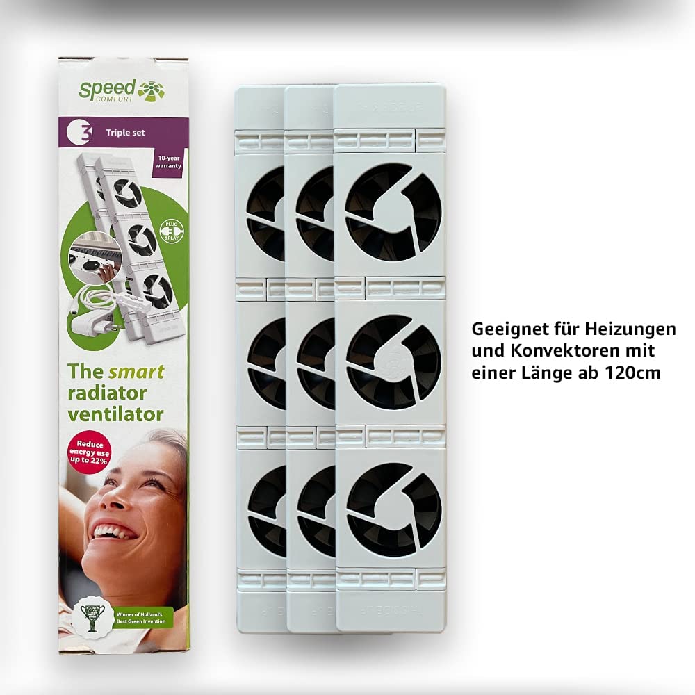 Das SpeedComfort 3.0 Trio-Set Standard Radiator 120cm+ ist eine innovative Lösung zur Wärmeunterstützung in großen Räumen. Das Set besteht aus drei Ventilatoren, die unter dem Heizkörper platziert werden und so für eine bessere Luftzirkulation sorgen. Dadurch wird die Wärme gleichmäßiger im Raum verteilt und es entsteht ein angenehmeres Raumklima.