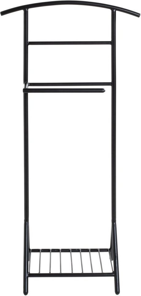 Der Herrendiener 23591 in elegantem Schwarz ist der ideale stumme Diener für stilbewusste Damen und Herren. Mit seinem funktionalen, modernen Design und klaren Linien sorgt er für Ordnung und knitterfreie Kleidung. Die praktische Schuhablage bietet Platz für Anzug, Hemd, Krawatte, Gürtel und Hose. Der stabile Kleiderbutler ist perfekt für den täglichen Gebrauch und passt harmonisch zu modernen sowie klassischen Einrichtungen. **Highlights** - Elegantes, modernes Design - Praktische Schuhablage - Stabile Konstruktion - Hohe Belastbarkeit bis 12 kg - Vielseitig einsetzbar für Kleidung und Accessoires **Produkteigenschaften** - Material: Metall schwarz lackiert - Maße (HxBxT): 101 x 45 x 26 cm **Lieferumfang** - 1 Herrendiener - Ausgeschlossen: Zubehör und Dekoration