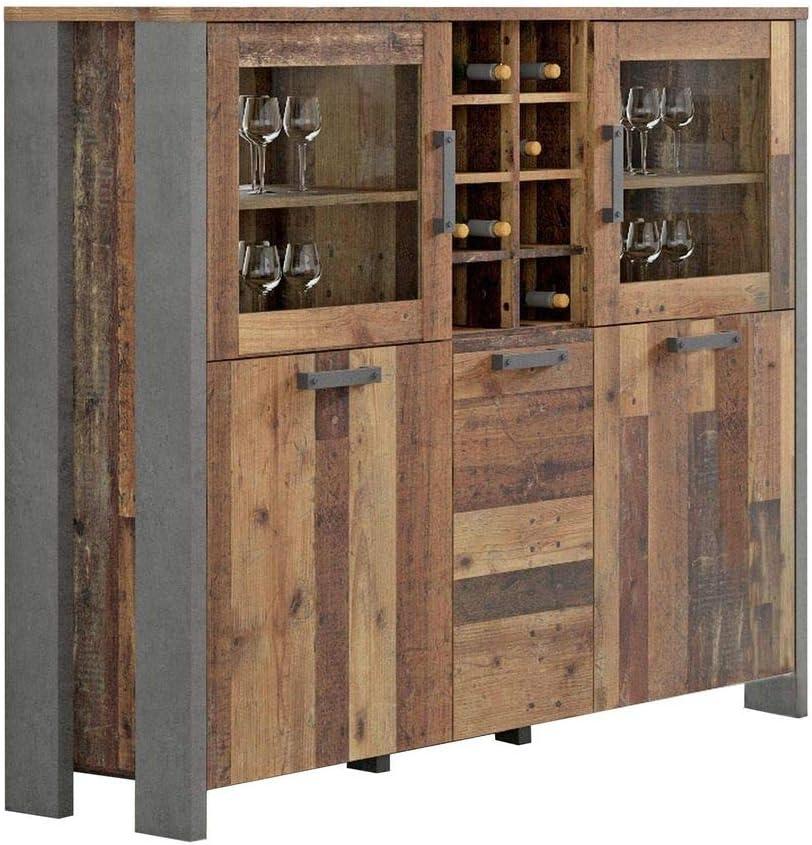 Dieses erstklassige Highboard ist mit seinen großzügigen Aufbewahrungsmöglichkeiten ein absolutes Stauraumwunder. Der Schrank wird in den Farben old wood vintage und Betonoptik dunkelgrau mit schwarzen Griffen geliefert. Hinter den praktischen Glaseinsätzen können Sie Dekoobjekte perfekt in Szene setzen. **Ausführung**: 1x Highboard CLIF **Material**: Holzspanwerkstoff, Glas Korpus: Old wood vintage Dekor Front: Old wood vintage Dekor Absetzungen: Beton dunkelgrau Dekor 2 Glastüren 3 Holztüren 8 Flaschenablagen 7 Holzböden Metallbeschläge Griffe: Schwarz Zerlegte Ware - Eine bebilderte Aufbauanleitung für die Endmontage liegt bei! **Maße**: B/H/T: ca. 151,4/127. 9/41,6 cm **Lieferumfang:** Originalverpackte Neuware Angebot ohne Beimöbel und Dekoration Wir bitten Sie zu beachten, dass die Farbdarstellungen der Produktbilder auf ihrem Monitor abweichen können und nicht verbindlich sind.