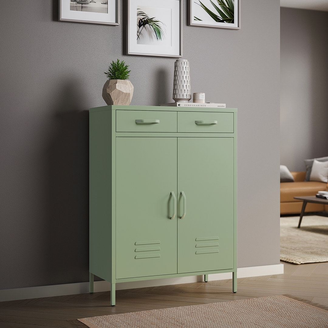 skølm 'Atria' Metallkommodegrün, 110x38x80 cm, mit 2 Schubladen und 2 Fächern