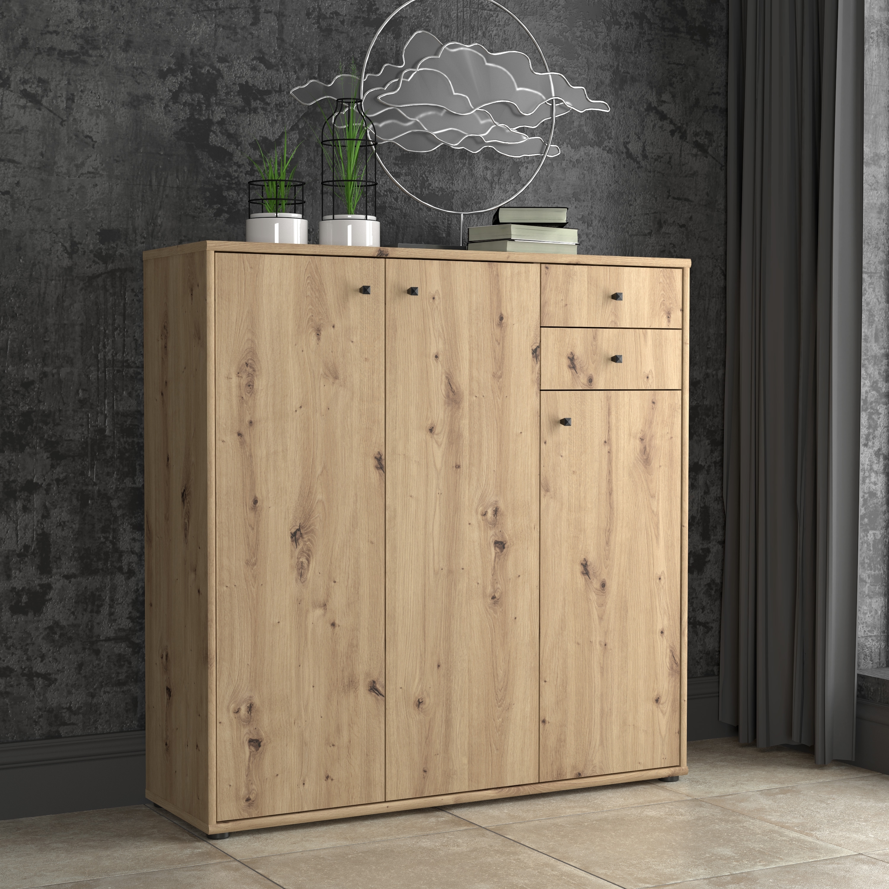 Komfortable Kommode als Universalschrank oder Schuhschrank und Büroschrank verwendbar von Forte, Die wertige Melamin Beschichtung sorgt für kratzfestere Oberflächen , Formschöne und dezente Knöpfe für modernen Look, Es wurden kugelgelagerte Metall Laufschienen verarbeitet und Metallbeschläge. **Produktinformationen** Zustand: neu, zerlegt & originalverpackt ohne Dekoration , Material: Holz / Spanplatte E1 , Farbe: Artisan Eiche Nb. Dekor , Größe: (Bx Hx T in cm): ca. 109 x 111 x 34,8 cm Besonderheit:. Produziert by Forte Möbel , Melamin Oberflächenbeschichtung , Metall Laufschienen kugelgelagert bei Schubladen , Metallbeschläge Ausstattung:. 2 Schubladen, 3 Türen, 4 Einlegeböden **Lieferung** Lieferung mit 2 Standardpaketen per Paketdienst Pflege:. feuchtes Tuch, keine lösungsmittelhaltigen Reiniger.
