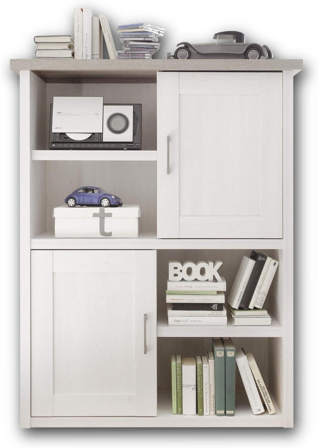 - Highboard - 4 Fächer, 2 Türen, je 1 Boden hinter den Türen - B/H/T: ca. 106 / 135 / 42 cm - Front und Korpus: Dekorfolie Pinie Weiß / Trüffel