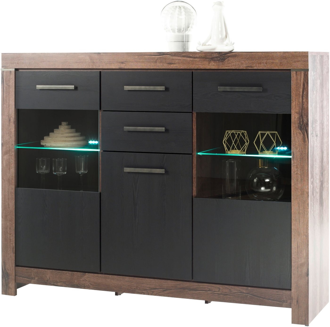 Mit dem Highboard »Balin mit LED-Beleuchtung« von HBZ gewinnen Sie wertvollen Stauraum und präsentieren Ihre Deko-Objekte stilvoll. Das moderne Design in Canyon Eiche Holznachbildung und Schwarz Eiche Holznachbildung sorgt für einen eleganten Kontrast. Die variable Einteilung der Fächer und die LED-Beleuchtung schaffen ein gemütliches Ambiente. Die Montage ist einfach und schnell durchführbar. **Highlights** - LED-Beleuchtung für ein gemütliches Wohnambiente - Flexibel einteilbarer Stauraum durch variable Einlegeböden - Modernes Design in Canyon Eiche und Schwarz Eiche - Einfache Montage dank detaillierter Anleitung - Hergestellt aus stabilem Holzwerkstoff **Produkteigenschaften** - Maße (BxHxT): 160 x 125 x 45 cm - Korpus: Canyon Eiche Holznachbildung - Front: Schwarz Eiche Holznachbildung / Glas - Ausstattung: 3 Türen (2 mit Glaseinsatz), 2 Schubkästen, 2 Glasböden, 3 Holzböden - Inklusive Beleuchtungs-Clips **Lieferumfang** - 1 Highboard - Ohne Dekoration