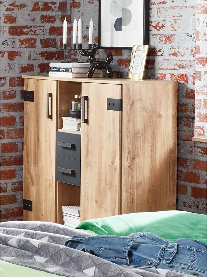 Beim Highboard Lakewood handelt es sich um ein modernes Jugendzimmer-Möbel, das mit seinem angesagten Industrial-Look alle Blicke auf sich zieht. Korpus, Rückwand und Front bestehen aus Holzwerkstoff und wurden in einer Plankeneiche-Nachbildung gestaltet. Als Kontrast fungiert die Absetzung im Ton Graphit, außerdem gibt es schwarze Griffe. Das ca. 124 x 105 x 41 cm große Highboard ist mit zwei gedämpften Türen und zwei offenen Fächern ausgestattet. Zudem erwarten Sie zwei Schubkästen inklusive Soft-Close-Funktion.