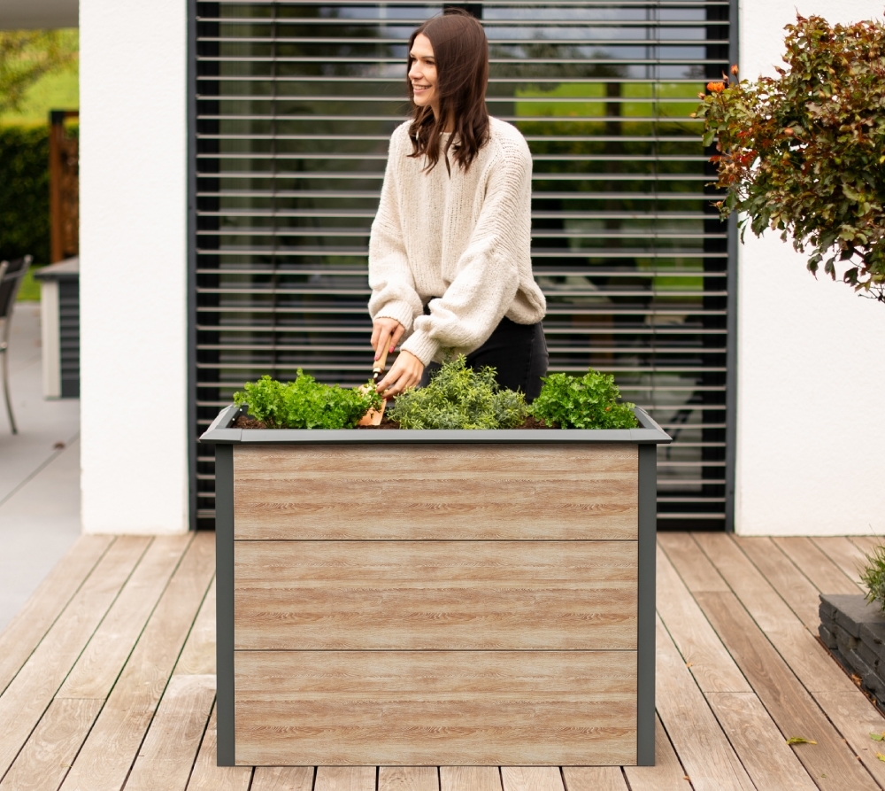 Das Westmann Metall Hochbeet Primus-Multi M in Holzoptik/Anthrazit bietet mit seinen Maßen 100 x 50 x 77 cm eine großzügige Kulturfläche und überzeugt durch modernes Design. Der Korpus aus verzinktem Stahl sorgt für Stabilität und Langlebigkeit. Die praktische Schneckenkante hält unerwünschte Besucher fern, während die offene Unterseite für eine gute Belüftung sorgt. Ideal für Balkone und kleine Terrassen, lässt sich das Hochbeet einfach montieren und bietet hohe Standortflexibilität. **Highlights** - Authentische Holzoptik: Modernes Design in ansprechender Optik - Großzügige Kulturfläche: Viel Platz für Pflanzen - Praktische Schneckenkante: Hält Schädlinge fern - Hohe Standortflexibilität: Ideal für Balkone und Terrassen - Einfache Montage: Schneller Aufbau ohne großen Aufwand **Produkteigenschaften** - Material: Galvanisierter Stahl (1,0 mm) - Klassisches Hochbeet Design - Universelle Einsatzmöglichkeiten - Edelstahlschrauben für Langlebigkeit - Offene Unterseite für gute Belüftung **Lieferumfang** - 1x Hochbeet Primus-Multi M - 1x Schneckenschutz - Montageanleitung