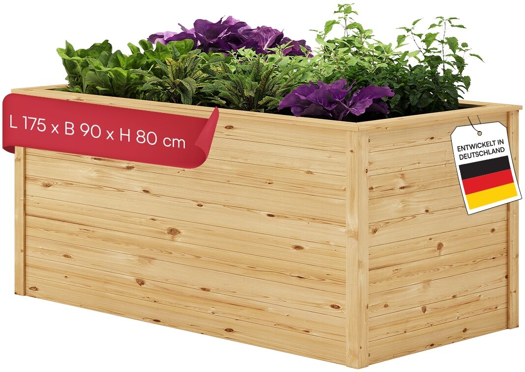 **Langlebiges Hochbeet aus Lärchenholz** Das Hochbeet Theemin bietet eine robuste und stilvolle Möglichkeit, Gemüse, Kräuter oder Blumen im eigenen Garten anzubauen. Gefertigt aus witterungsbeständigem Lärchenholz, kombiniert es natürliche Schönheit mit hoher Stabilität und passt sich harmonisch jeder Gartengestaltung an. **Natürlich widerstandsfähig** Lärchenholz ist ideal für den Outdoor-Bereich geeignet, da es von Natur aus resistent gegen Feuchtigkeit, Schädlinge und Witterungseinflüsse ist. Das macht Theemin besonders langlebig und sorgt dafür, dass es über viele Jahre Freude bereitet. Mit der Zeit entwickelt das Holz eine edle silbergraue Patina – ein natürlicher Alterungsprozess, der jedes Hochbeet einzigartig macht. **Geschützt durch UV-Schutzlackierung** Für zusätzliche Haltbarkeit ist das Hochbeet mit einer transparenten UV-Schutzfarbe lackiert. Diese bewahrt das Holz vor dem Ausbleichen durch Sonneneinstrahlung und schützt zugleich vor Regen und Feuchtigkeit. Dadurch bleibt das Hochbeet pflegeleicht und behält langfristig seine hochwertige Optik. **Viel Platz für gesundes Pflanzenwachstum** Mit großzügigen Maßen von 175 x 90 x 80 cm bietet Theemin viel Raum für vielfältige Bepflanzungen. Die Innenmaße von 162,5 x 77,5 x 78,5 cm eignen sich ideal für Gemüse, Kräuter oder Blumen. Die mitgelieferte Kunststofffolie schützt das Holz im Inneren zuverlässig vor Feuchtigkeit – für ein dauerhaft stabiles und formbeständiges Beet. **Einfache Montage & vielseitige Nutzung** Das Hochbeet lässt sich schnell montieren und ist sofort einsatzbereit. Ob für Kräuter, Blumen oder Gemüse – Theemin sorgt für optimale Wachstumsbedingungen und macht die Gartenarbeit komfortabler und effizienter. **Produktdetails:** - Material: Lärchenholz - Farbe: Natur - Oberfläche: Mit transparenter UV-Schutzfarbe für den Outdoor-Bereich lackiert - Produktmaße: 175L x 90B x 80H cm - Innenmaße: 162,5L x 77,5B x 78,5H cm - Inklusive hochwertiger Kunststofffolie zum Schutz des Holzes - Schnelle und einfache Selbstmontage - Langlebig, pflegeleicht und witterungsbeständig - Ideal für Gemüse, Kräuter, Blumen und andere Pflanzen - UV-Schutzlackierung zur Vermeidung von Verfärbungen