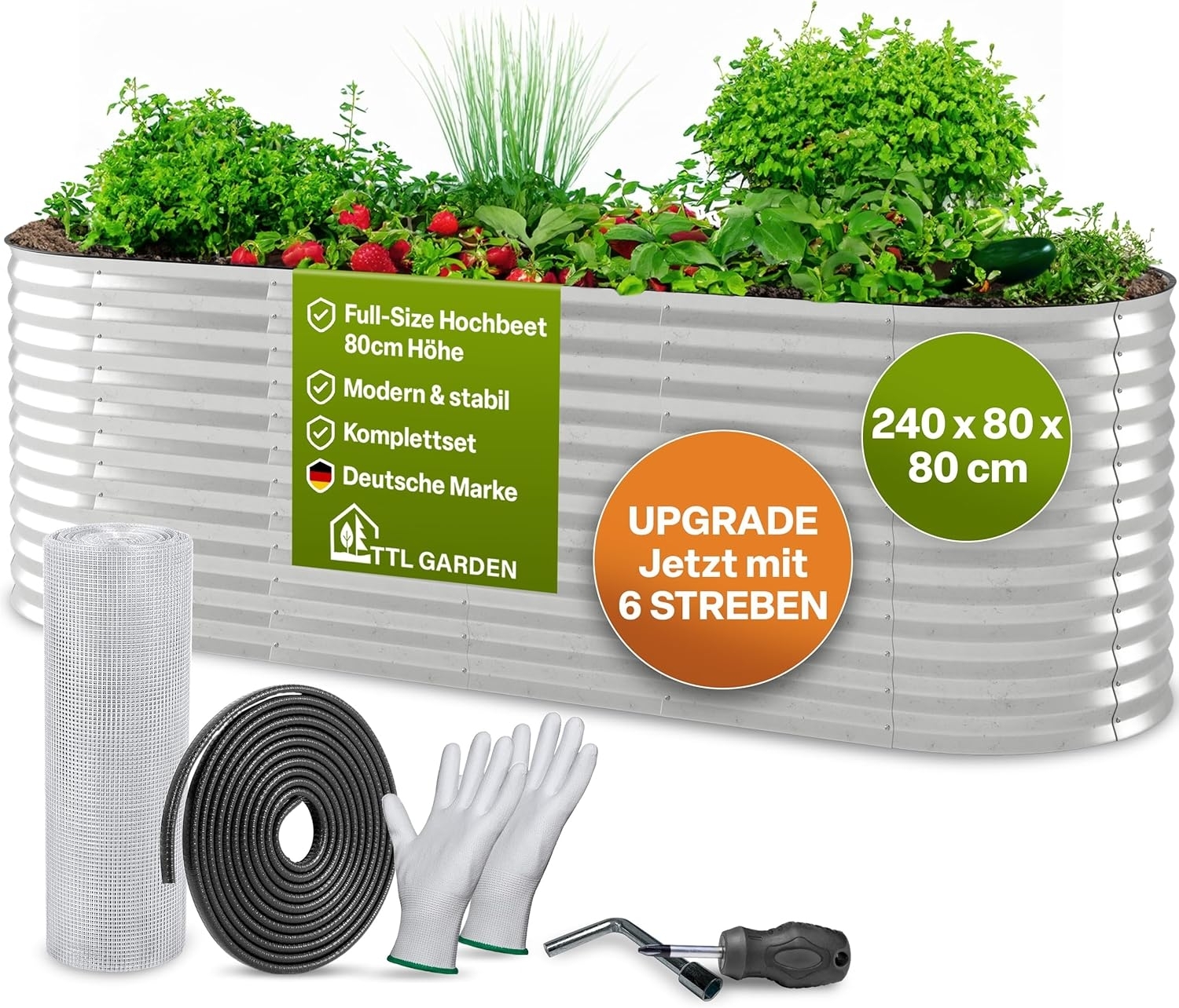TTL Garden ovales Garten-Hochbeet "Spirit" in silber verzinkt vereint modernes Design mit exzellenter Wetterbeständigkeit. Hergestellt aus hochwertigem 0,6 mm dickem Stahlblech, bietet es eine große Anbaufläche von 240 x 80 x 80 cm und ermöglicht rückenschonendes Gärtnern. Die komplette Ausstattung umfasst rostfreie Edelstahlschrauben und Ungeziefer-Draht für eine einfache Montage und effektiven Schutz vor Schädlingen. **Highlights** - Zeitgemäßes Design für optimale Gartengestaltung - Hochwertiges verzinktes Stahlblech für exzellente Wetterbeständigkeit - Komplette Ausstattung für einfaches Aufstellen von Pflanzkästen - Ergonomische Arbeitshöhe von 80 cm für rückenschonendes Gärtnern - Stabilität durch 6 Innen-Verstrebungen und Zink-Aluminium Beschichtung **Produkteigenschaften** - Maße (LxBxH): 240 x 80 x 80 cm - Ideal für verschiedenste Pflanzschichten - Inklusive rostfreier Edelstahlschrauben und Ungeziefer-Draht - Witterungsbeständig und pflegeleicht **Lieferumfang** - Garten-Hochbeet "Spirit" in silber verzinkt - Alle erforderlichen Montageteile - Detaillierte Aufbauanleitung