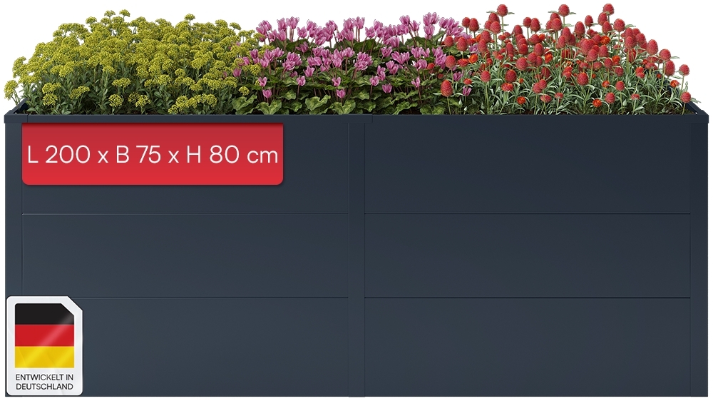 | Name | STEELSØN 'Icarus' Hochbeet, Metall, anthrazit, wetterfest, 200x75x80 cm, Pflanzenbeet mit offener Bodenstruktur |