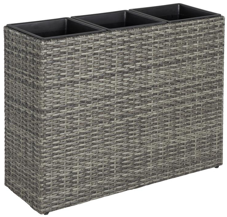 ESTEXO Hochbeet Polyrattan Blumenkübel Set in Anthrazit-Grau bietet eine stilvolle und praktische Lösung für Ihre Pflanzen. Dieses 3er Set ist sowohl für den Innen- als auch Außenbereich geeignet und überzeugt durch seine UV- und wetterfeste Beschaffenheit. Mit einem wiederverschließbaren Wasserabfluss und verstellbaren Füßen ist es ideal für unterschiedliche Bodenverhältnisse. Die einfache Reinigung sorgt für zusätzlichen Komfort. **Highlights** - UV- und wetterfest für langlebige Nutzung im Freien - Wiederverschließbarer Wasserabfluss mit Gummidichtung - Verstellbare Füße zum Ausgleich von Unebenheiten - Einfach zu reinigen für mühelose Pflege - Ideal als Sichtschutz oder Raumtrenner **Produkteigenschaften** - Außenmaße gesamt (L x B x H): 77 x 27 x 60 cm - Innenmaße Einsätze (L x B x H): 22 x 22 x 24,5 cm - Überstand (Rand) der Töpfe: ca. 1,5 cm - Material Gestell: Metall mit Polyrattan Umrandung - Material Blumentöpfe: Kunststoff - Farbe: Anthrazit-Grau