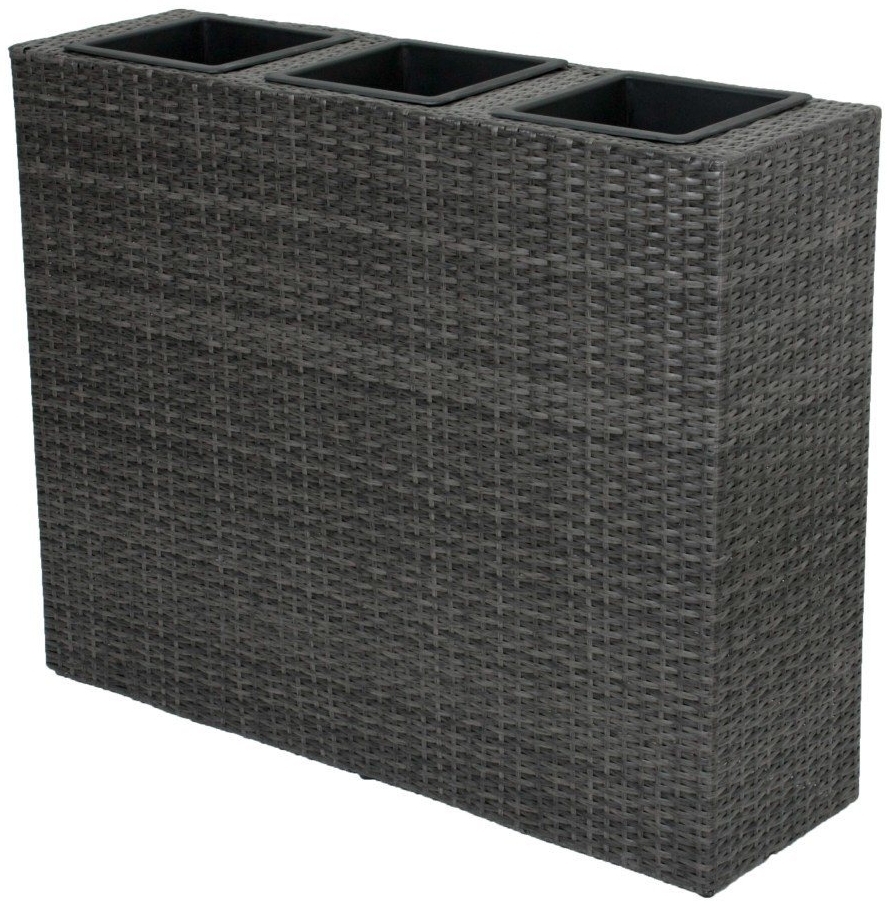 Raumtrenner mit 3 Pflanztöpfen in dunkelgrau. Dieser stilvolle Raumteiler aus Stahl und Kunststoffgeflecht bietet nicht nur eine praktische Trennung von Räumen, sondern auch Platz für Ihre Pflanzen. Mit einer stabilen Ausführung und wetterfestem Material ist er ideal für Terrasse, Balkon oder Garten geeignet. Die präzise Verarbeitung und die bereits integrierten Pflanztöpfe machen ihn zu einem optischen Highlight. **Highlights** - 3 integrierte Pflanztöpfe für kreative Gestaltung - Wetterfestes Material für den Außenbereich - Stabile Ausführung aus Stahl - Präzise Verarbeitung für hohe Qualität - Ideal für Terrasse, Balkon oder Garten **Produkteigenschaften** - Material: Stahl / Kunststoffgeflecht - Farbe: dunkelgrau - Maße (LxBxH): 100 x 30 x 80 cm - Maße Einsätze (LxBxH): 24,7 x 24,7 x 20 cm - Einzelgewicht: 6,559 kg - Verpackungsmaße (LxBxH): 101,5 x 32,5 x 82,5 cm **Lieferumfang** - 1 Raumtrenner mit 3 Pflanztöpfen - Pflanzen nicht enthalten