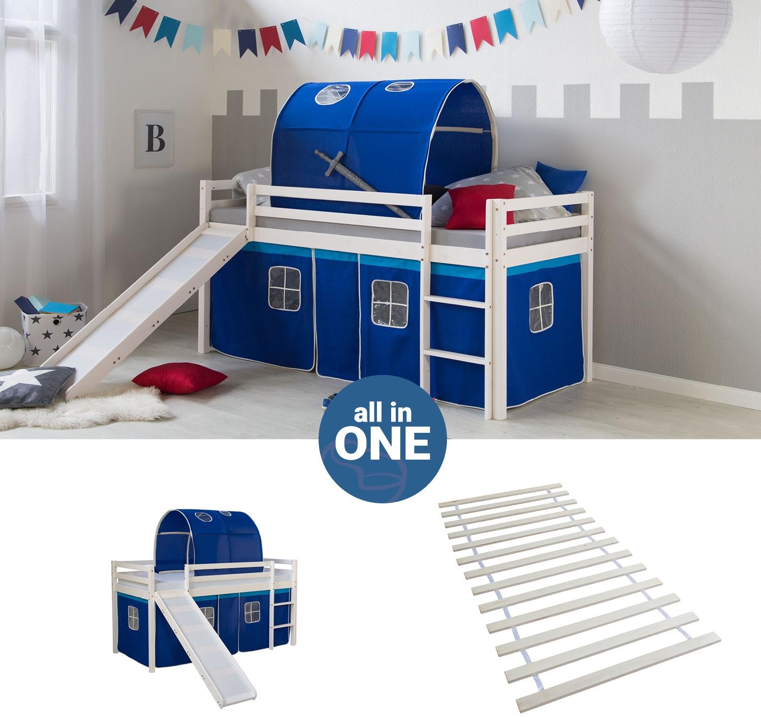 | Name | Homestyle4u Spielbett mit Lattenrost, Rutsche und Tunnel Stockbett, blau, Kiefernholz weiß, 90x200 cm |