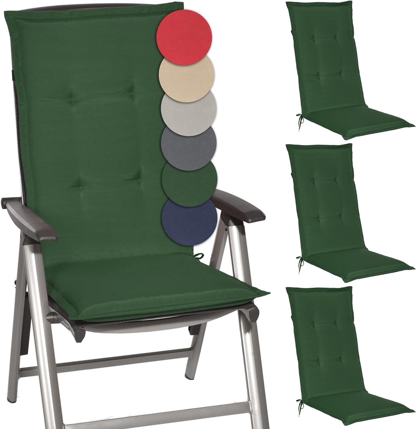 Die Beautissu Hochlehner Auflagen Loft HL sind die ideale Ergänzung für Ihre Gartenstühle. Mit einer Polsterung von ca. 6 cm bieten sie hohen Sitzkomfort. Die Auflagen sind mit einem Stehsaum und 4 Kreisheftungen in der Rückenlehne ausgestattet. Dank der Befestigungsbänder auf der Rückseite und an der Sitzfläche lassen sie sich einfach und sicher befestigen. Die Maße betragen ca. 120 x 50 x 6 cm und der Stoff besteht aus 100% Polyester, der UV-lichtecht ist. **Highlights** - Hochwertige Hochlehner Auflagen für Gartenstühle - Ca. 6 cm starke Polsterung für hohen Sitzkomfort - Einfache Befestigung mit Befestigungsband und Befestigungsbändern - Geeignet für die meisten Hochlehner Stühle und Multipositions-Sessel - UV-lichtechter Stoff aus 100% Polyester **Produkteigenschaften** - Maße der Auflage: ca. 120 x 50 x 6 cm - Maße der Sitzfläche: ca. 50 x 50 cm - Maße des Rückenpolsters: ca. 70 x 50 cm - Anzahl: 4 Stück - Gewicht: ca. 700 g - Material des Stoffes: 100% Polyester - Füllung: 100% Polyurethan Schaumplatte, Ummantelung 100 % Polyesterfaser - UV Lichtechtheit: 5 - STANDARD 100 by OEKO-TEX unter der Prüfnummer 17.HOT.23038 **Lieferumfang** - 4x Beautissu Hochlehner Auflage Loft HL 120 x 50 x 6 cm dunkelgrün - Gartenstuhl nicht im Lieferumfang enthalten