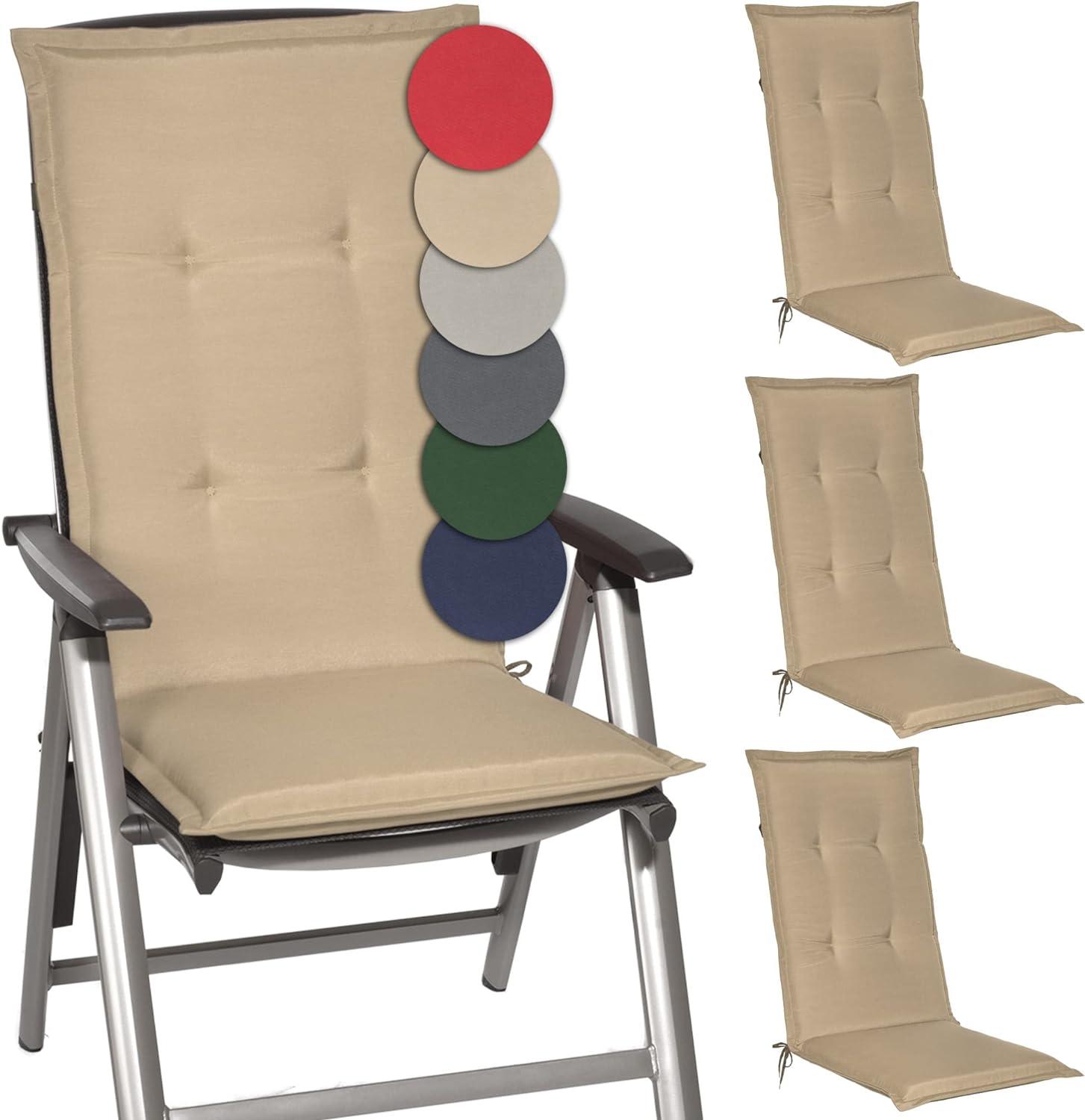 Beautissu 4er Set Hochlehner Auflagen Loft HL 120 x 50 x 6 cm Natur. Diese hochwertigen Auflagen bieten mit einer Polsterung von ca. 6 cm hohen Sitzkomfort und sind ideal für Ihre Gartenstühle. Sie verfügen über einen Stehsaum und 4 Kreisheftungen in der Rückenlehne. Dank der Befestigungsbänder lassen sie sich einfach und sicher anbringen. Der UV-lichtechte Stoff aus 100% Polyester sorgt dafür, dass die Farben auch bei Sonneneinstrahlung erhalten bleiben. **Highlights** - Hochwertige Hochlehner Auflagen für Gartenstühle - Ca. 6 cm starke Polsterung für hohen Sitzkomfort - Einfache Befestigung mit Befestigungsband und Befestigungsbändern - Geeignet für die meisten Hochlehner Stühle und Multipositions-Sessel - UV-lichtechter Stoff aus 100% Polyester **Produkteigenschaften** - Maße der Auflage: ca. 120 x 50 x 6 cm - Maße der Sitzfläche: ca. 50 x 50 cm - Maße des Rückenpolsters: ca. 70 x 50 cm - Anzahl: 4 Stück - Gewicht: ca. 700 g - Material des Stoffes: 100% Polyester - Füllung: 100% Polyurethan Schaumplatte, Ummantelung 100 % Polyesterfaser - UV Lichtechtheit: 5 - STANDARD 100 by OEKO-TEX unter der Prüfnummer 17.HOT.23038 **Lieferumfang** - 4x Beautissu Hochlehner Auflage Loft HL 120 x 50 x 6 cm (Gartenstuhl nicht enthalten)