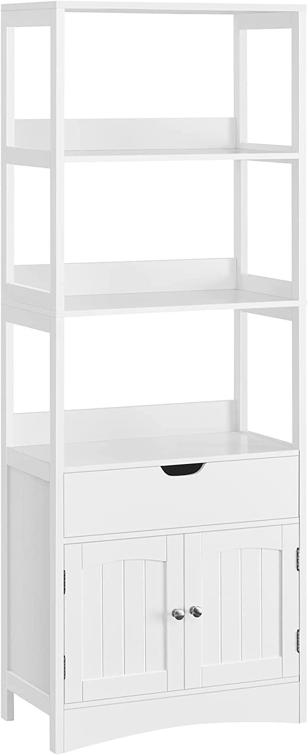 Vasagle HochschrankBadezimmerschrank, 3 offene Fächer, 1 Schublade und 2 Schranktüren, Premium-MDF weiß, 60 x 32,5 x 154 cm