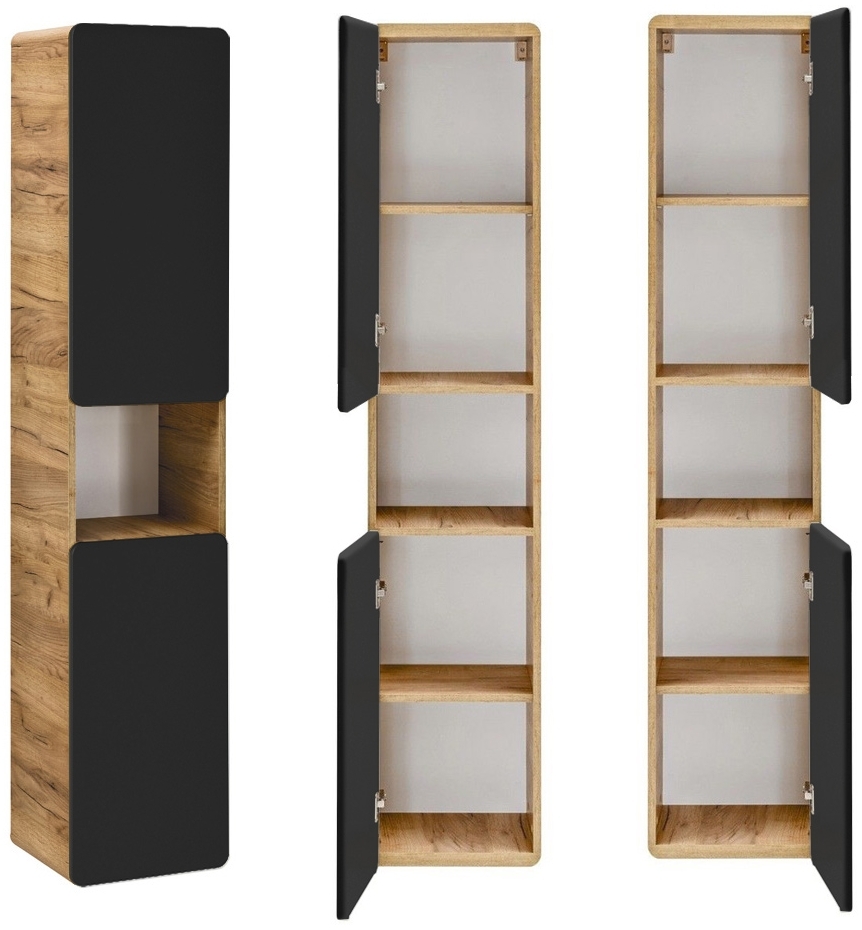| Name | Badezimmer Hochschrank NEW-LUTON in seidenmatt anthrazit mit Wotan Eiche Nb, B/H/T ca. 35/170/32 cm |