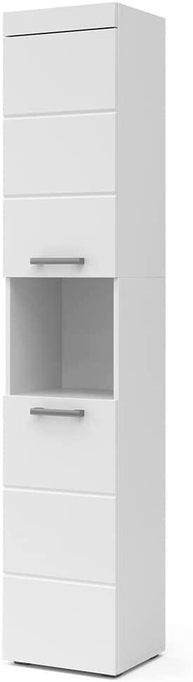 Der Badschrank Luna ist nicht nur ein einfacher Hochschrank, sondern eine wahre Raumlösung für Ihr Badezimmer. Mit seinem schmalen Design passt er perfekt in jedes Bad und bietet dabei genügend Staumöglichkeiten. Das offene Fach sorgt für einen dekorativen Touch und die zwei Türen ermöglichen den verschlossenen Stauraum. Durch die Anzahl der insgesamt fünf Fächer bietet der Badschrank zusätzliche Flexibilität bei der Organisation von Handtüchern, Kosmetikartikeln und anderen praktischen Badutensilien. Das Tolle an diesem Schrank ist, dass die Richtung der Türöffnung umgekehrt werden kann, um es an Ihre individuellen Bedürfnisse anzupassen. Passend zu anderen Artikeln der Kollektion Luna, macht dieser Badschrank Ihr Bad komplett. Holen Sie sich nun den Luna Badschrank und bringen Sie das gewisse Etwas in Ihr Badezimmer. --- **Technische Details:** **Farbe:** Weiß **Abmessungen:** 32 x 37 x 190 cm (BxHxT) **Material:** Spanplatte, 16 mm **Oberfläche:** Melaminharzbeschichtung **Artikelgewicht inkl. Verpackung:** 28.6 kg. **Artikelgewicht:** 26.62 kg. --- LIEFERUMFANG: Badschrank, Montageanleitung, Montagematerial