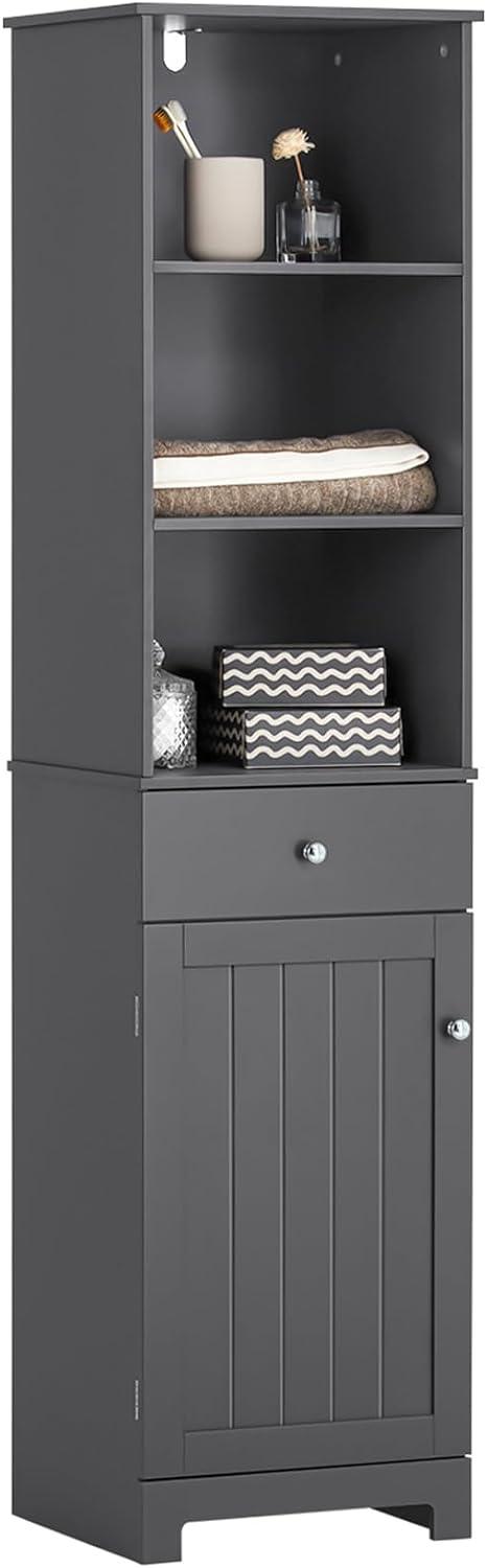 Der SoBuy BZR17-DG Badezimmer Hochschrank in dunkelgrau bietet mit 3 offenen Fächern, 1 Schublade und 1 Tür viel Stauraum für Badartikel. Aus lackiertem MDF(E1) gefertigt, überzeugt er mit einer Belastbarkeit von bis zu 30kg. Vielseitig einsetzbar im Bad, Wohnzimmer oder Flur. Inklusive verschiedenfarbiger Griffe in Schwarz und Silber. **Highlights** - Viel Stauraum mit 3 offenen Fächern, 1 Schublade und 1 Tür - Belastbarkeit von bis zu 30kg - Vielseitig einsetzbar im Bad, Wohnzimmer oder Flur - Inklusive verschiedenfarbiger Griffe in Schwarz und Silber - Kann als 4-teiliges Set erworben werden **Produkteigenschaften** - Gewicht: ca. 23 kg - Material: MDF(E1), lackiert - Produktmaße: BHT ca. 40 x 161 x 35 cm - Paketmaße: 90 x 17 x 45 cm **Lieferumfang** - SoBuy BZR17-DG Badezimmer Hochschrank - Verschiedenfarbige Griffe in Schwarz und Silber
