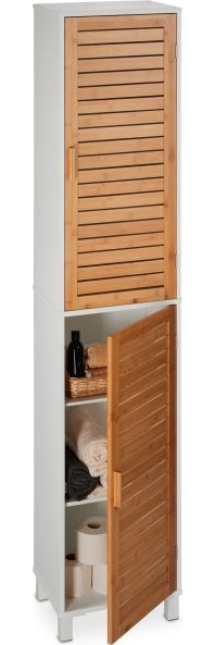 Der hohe Badezimmerschrank 10049743 ist die ideale Lösung für kleine Badezimmer. Mit kompakten Abmessungen von ca. 190 x 40 x 30 cm bietet er in 6 Fächern ausreichend Platz für Duschbad, Lotionen und weitere Badaccessoires. Die Höhen der Fächer sind durch 2 verstellbare Einlegeböden flexibel anpassbar. Der elegante Materialmix aus weißem MDF und natürlichen Bambustüren sorgt für eine ansprechende Optik. **Highlights** - Hohes, schmales Design – ideal für kleine Bäder - 6 Schrankfächer für Badartikel und Handtücher - 2 verstellbare Einlegeböden für flexible Fächerhöhe - Schranktüren mit cleverem Magnetverschluss - Dekorative Kombination aus weißem MDF und Bambus **Produkteigenschaften** - Maße H x B x T: ca. 190 x 40 x 30 cm - Fächer B x T: ca. 36,5 x 27 cm - Höhe Fächer ohne Einlegeboden: ca. 31 cm - Höhe Fächer mit Einlegeboden: ca. 23/33 cm, 29/37 cm, 35,5/20,5 cm - Traglast je Fach: max. 5 kg - Gewicht: ca. 24,3 kg - Material: MDF, Bambus, Kunststoff - Farbe: Weiß, Natur **Lieferumfang** - 1x Badschrank in Einzelteilen - Mit Anleitung und Montagematerial - Dekoartikel sind nicht im Lieferumfang enthalten
