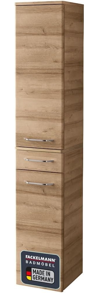Der Fackelmann MILANO Hochschrank 30 cm, Braun hell, ist ein schlichtes und harmonisches Möbelstück für jedes Badezimmer. Mit seinem natürlichen Eichen-Look verleiht er der Badeinrichtung eine natürliche Note. Der Hochschrank bietet viel Stauraum mit einer Schublade und zwei Türen. Die Türen haben einen frei wählbaren Türanschlag und schließen sanft dank der gedämpften Scharniere. Die Schublade schließt mit dem Soft-Close-System. Der Hochschrank wird zerlegt geliefert und ist einfach zu montieren. **Highlights** - Schlichtes Design, das sich harmonisch in jedes Badezimmer einfügt - Natürlicher Eichen-Look für eine natürliche Badeinrichtung - Viel Stauraum mit einer Schublade und zwei Türen - Türen mit frei wählbarem Türanschlag und gedämpften Scharnieren - Schublade mit Soft-Close-System **Produkteigenschaften** - Maße: 30,5 cm Breite, 165,5 cm Höhe, 32 cm Tiefe - Ausstattung: 2 Türen, 1 Schublade, 4 Glaseinlegeböden, Querteile und Rückwand silbergrau - Made in Germany - Produktion in Hersbruck bei Nürnberg in Franken **Lieferumfang** - Zerlegter Hochschrank MILANO 30 cm, Braun hell - Leicht verständliche Montageanleitung