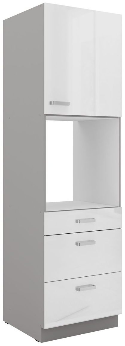Küchen Hochschrank 60 cm aus dem Küchenprogramm BIANCA in Hochglanz Weiß und Grau matt. Er bietet viel Stauraum mit 3 Schubkästen, einer Tür und einem offenen Fach sowie Platz für einen autarken Backofen. Die Maße betragen 60 cm Breite, 55 cm Tiefe und 210 cm Höhe. **Highlights** - Viel Stauraum mit 3 Schubkästen und einer Tür - Platz für autarken Backofen in der Nische - Hochwertige gedämpfte Vollauszüge für leises Schließen - Front aus MDF Hochglanz Weiß - Korpus aus Spanplatte Laminat in Grau matt **Produkteigenschaften** - Frontenkanten: ABS Dickkante Weiß - Griff: Metall Chromoptik, Lochabstand 128 mm - Scharniere mit Dämpfer für leises Schließen - Türanschlag rechts oder links wählbar - Passgenau für die Küchenmodelle BIANCA, GREY und ROSE **Lieferumfang** - Hochschrank 60 cm wie beschrieben, zerlegt und originalverpackt
