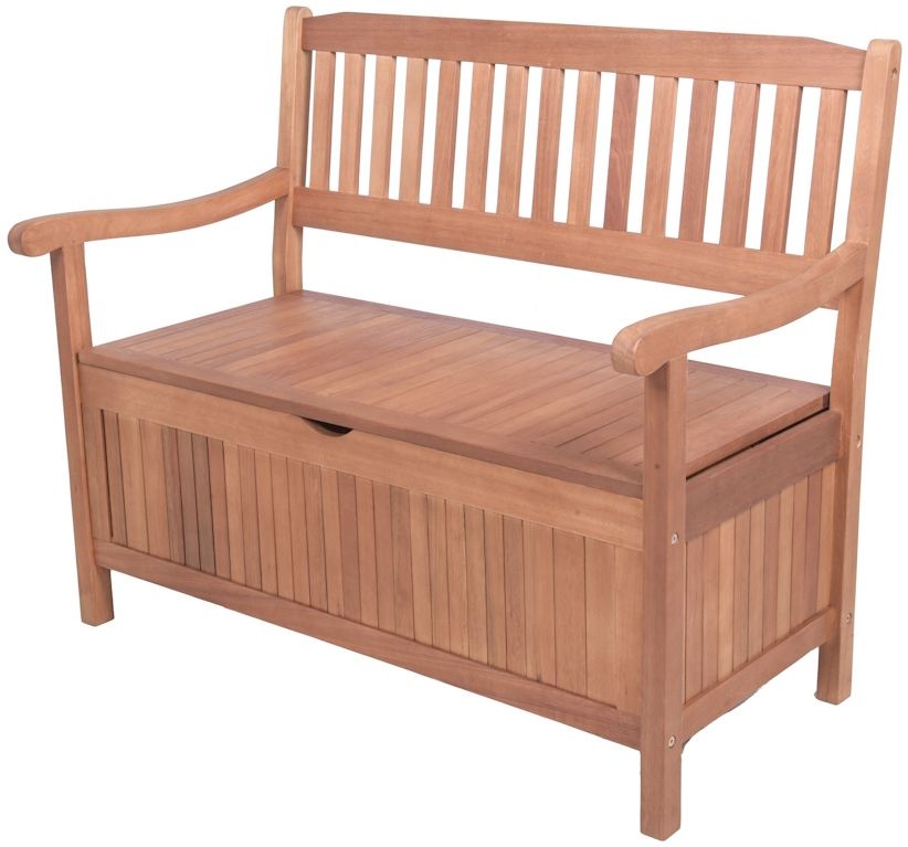 ## Gartenbank mit viel Stauraum für alles was am Abend nicht im Garten liegen bleiben soll. Mit einer Breite von 107 cm bietet die dekorative Gartenbank / Truhenbank aus Eukalyptus eine komfortable Sitzfläche für zwei Personen. Hergestellt wurde sie aus FSC-zertifiziertem Eukalyptusholz, welches bereits von Natur aus eine hohe Widerstandsfähigkeit gegen Witterungseinflüsse besitzt. Unterhalb der Sitzfläche befindet sich ein Stauraum, der als nützliche Aufbewahrungsmöglichkeit für Sitzkissen genutzt werden kann. Das ansprechende Landhausdesign der wunderschönen und zugleich praktischen Bank bietet in jedem Gartenambiente und auf jeder Terrasse einen attraktiven Blickfang. Ob als Einzelstück oder kombiniert mit passenden Gartenmöbeln - sie begeistert gleichermaßen als praktisches wie dekoratives Highlight. Die Gartenbank ist aus 100% Eukalyptus Grandis Holz * **Maße: 107 cm breit, 59 cm tief und 90 cm hoch.** * **Innenmaße der Truhe: B/T/H 99 x 42 x 28 cm** * **Sitzhöhe 46 cm** Die Bank wird zerlegt im Karton geliefert, ist aber einfach zu montieren. Die Truhe ist nicht wasserdicht!