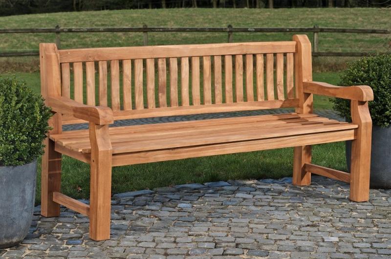 **Teakbank Jackson V2** Die Teakbank Jackson V2 ist eine robuste Sitzbank aus massivem Teakholz, die sich ideal für jeden Garten eignet. Mit ihrem zeitlosen Sprossen-Design und der ergonomischen Form bietet sie hohen Sitzkomfort. Die stabilen Standbeine aus 7 x 7 cm starken Vollholz-Bohlen garantieren Langlebigkeit. Das hochwertige Teakholz ist wetterfest und kann ganzjährig im Freien stehen. **Highlights** - Solide Sitzbank aus massivem Teakholz - Zeitloses Sprossen-Design - Ergonomischer Sitzkomfort mit gewölbter Sitzfläche, geneigter Rückenlehne und bequemen Armlehnen - Stabile Standbeine aus 7 x 7 cm starken Vollholz-Bohlen - Hochwertiges und strapazierfähiges Edelholz Teak **Produkteigenschaften** - Gesamtbreite: 120 cm, 150 cm, 180 cm, 200 cm, 220 cm oder 240 cm - Gesamttiefe: 61 cm - Gesamthöhe: 93 cm - Sitzhöhe: 45 cm - Sitztiefe: 52 cm - Max. Belastbarkeit: 300 kg - Gewicht: 35 kg (120 cm), 38 kg (150 cm), 43 kg (180 cm), 46 kg (200 cm), 50 kg (220 cm), 52 kg (240 cm)