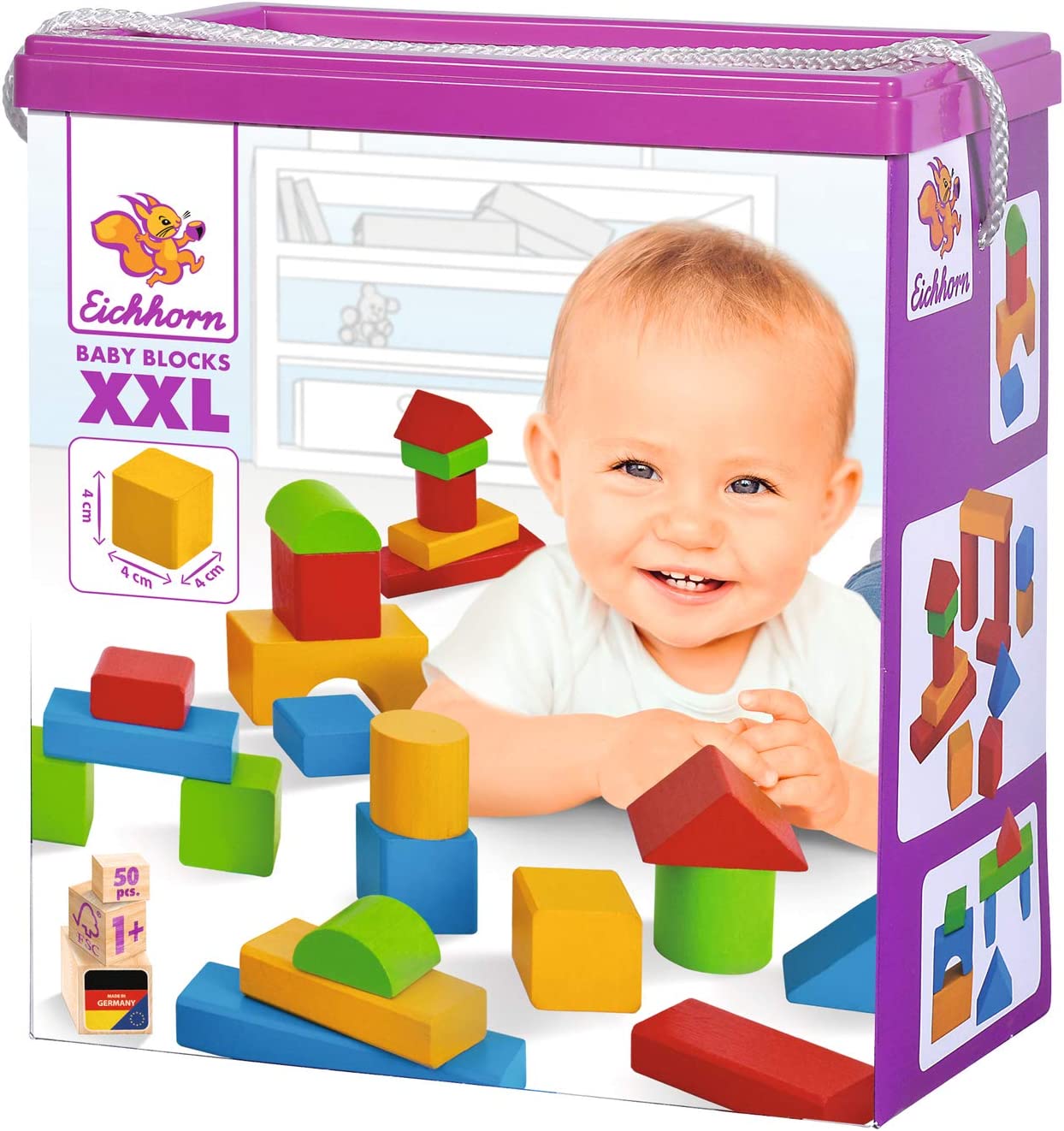 Mit den extra großen Eichhorn 40x40mm Babybausteinen werden selbst Kinder ab einem Jahr schon zu den besten Baumeistern. Hier wird die Kreativität der Kleinen durch 50 Bausteine in verschiedenen Formen und Farben gefördert. Sämtliche Bestandteile sind „Made in Germany“ und werden im Bayerischen Wald aus hochwertigem Buchenholz hergestellt. Besonders praktisch ist die Aufbewahrungsbox mit Kordel und Deckel. Der Klassiker der in jedes Kinderzimmer gehört. Durch die verschiedenen Formen und Farben werden die Sinne der Kleinen spielerisch gefördert. Die Wahrnehmung von Farben, Hand-Auge-Koordination und Geschicklichkeit stehen hier im Vordergrund Die extra großen Holzbausteine mit dem Grundmaß von 40mm haben unterschiedliche Formen und haben die perfekte Größe für die ersten Stapelversuche Ihrer Kleinsten. Die Box selbst dient hervorragend zum Verstauen der Bausteine Fördert die Motorik - Die Holzbausteine haben unterschiedliche Farben und Formen. Durch das Spielen mit dem Bausteinen werden die Koordination und Motorik gefördert. Geeignet für Kinder ab 1 Jahr 100% FSC zertifiziertes Holz - Für die Herstellung unser Holzbausteine wird ausschließlich zertifiziertes Buchenholz verwendet. Lizenznummer: FSC-C005308 Für die Farbgebung unserer Holzbausteine verwenden wir aussließlich wasserbasierende Farben die unbedenklich sind Qualität Hergestellt in Deutschland- Durch penibel abgerundete Ecken und Kanten, Materialien frei von Schadstoffen und Weichmachern sowie der Qualitätskontrolle sorgen wir für Spielzeug in Top-Qualität