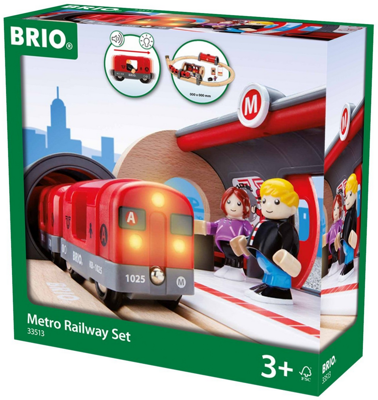 - Das BRIO Metro Bahn Set 33513 besteht aus 20 Teilen, darunter ein 3-teiliger Metrozug mit Licht- und Soundeffekten.