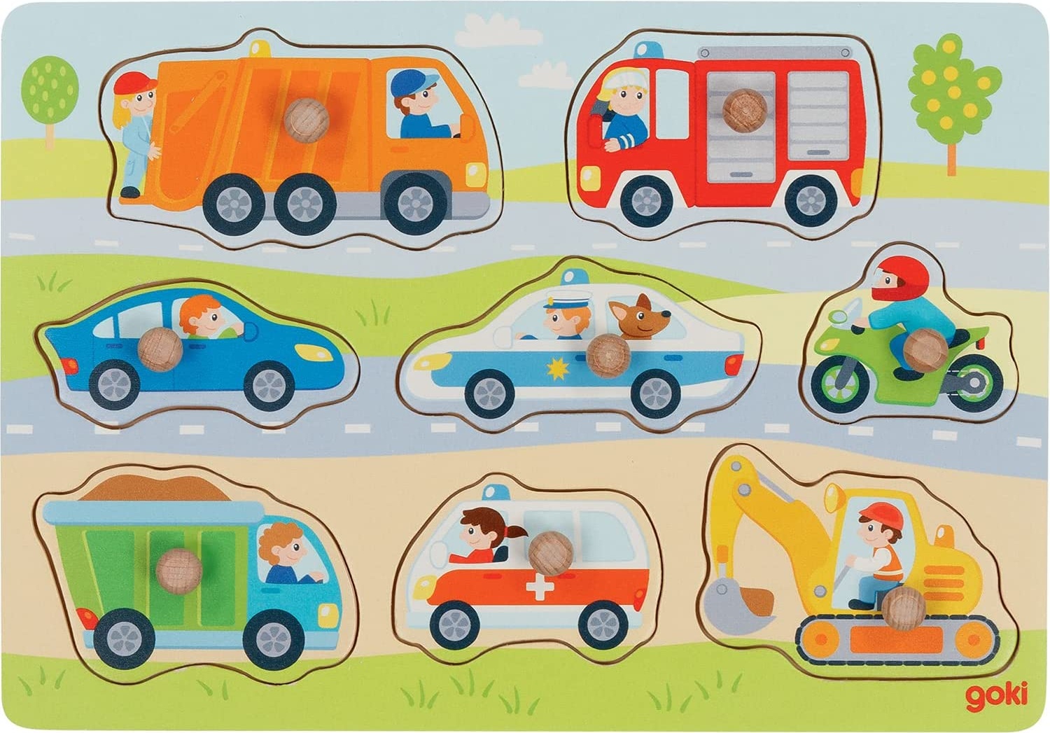 - Das Goki Steckpuzzle Verkehrsmittel verfügt über extra große Knöpfe, die das Greifen für kleine Kinder erleichtern.