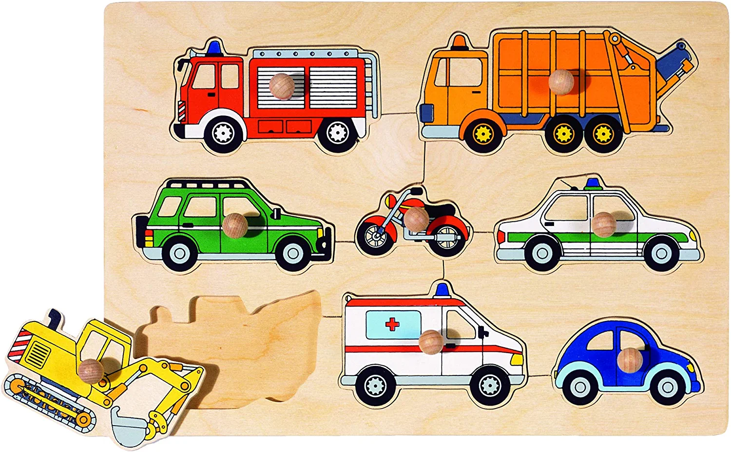- Das Goki 57996 Steckpuzzle verfügt über extra große Holzknöpfe, die das Greifen für kleine Hände erleichtern.