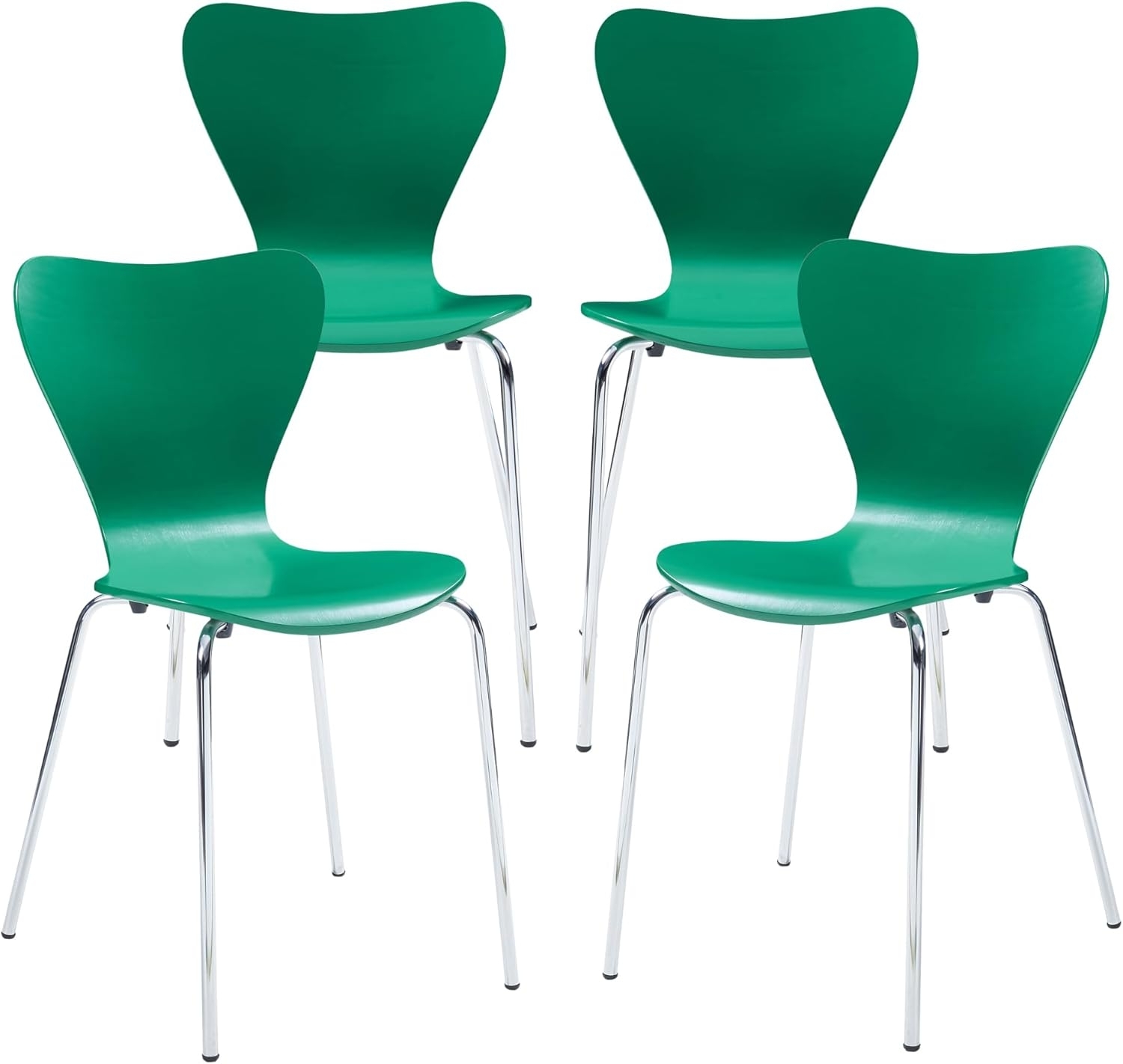 Diese vier stilvollen Esszimmerstühle im Set bieten eine gemütliche Sitzgelegenheit und schaffen eine ansprechende Atmosphäre in Ihrem Raum. Die Stühle sind stapelbar und ermöglichen so eine platzsparende Aufbewahrung. Mit einem stabilen Stand durch vier Stuhlbeine und einer Belastbarkeit von bis zu 150 kg garantieren sie ein komfortables Sitzerlebnis. Ideal für verschiedene Einsatzmöglichkeiten, sei es im Wohnzimmer, in der Küche oder im Esszimmer. **Highlights** - Vier stilvolle Stühle im Set - Stabiler Stand durch vier Stuhlbeine - Einfache Montage und schneller Aufbau - Stühle platzsparend stapelbar - Belastbar bis zu 150 kg **Produkteigenschaften** - Maße (HxBxT): 80 x 48 x 45,5 cm - Sitzhöhe: 46 cm - Material: Sitzschale aus Birkensperrholz, Stuhlbeine aus Metall - Farbe: Sitzschale in Grün, Stuhlbeine in Chrom **Lieferumfang** - 4 x Esszimmerstuhl