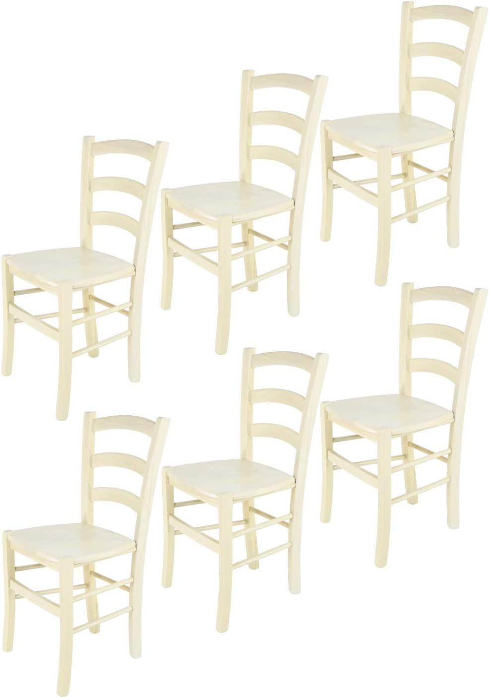 Tommychairs präsentiert das 6er Set Stühle Venice, ideal für Küche und Esszimmer. Die robuste Struktur aus lackiertem Buchenholz in Anilinfarbe Weiß und die Holzsitzfläche garantieren Langlebigkeit und Stil. Mit einer Gesamthöhe von 88 cm, einer Breite von 43 cm und einer Tiefe von 44 cm bieten diese Stühle sowohl Komfort als auch Eleganz. Die maximale Belastbarkeit beträgt 120 kg. **Highlights** - Robuste Struktur aus lackiertem Buchenholz - Sitzfläche aus Holz - 100% MADE IN ITALY - Traditionelles und elegantes Design - Perfekt für Küche, Esszimmer, Bars und Restaurants **Produkteigenschaften** - Gesamthöhe: 88 cm - Gesamtbreite: 43 cm - Gesamttiefe: 44 cm - Sitztiefe: 37 cm - Sitzhöhe: 47 cm - Belastbarkeit: max. 120 kg **Lieferumfang** - 6 Stühle Venice - Komplett aufgebaut geliefert - Materialien: lackiertes Buchenholz und Holzsitzfläche - Handwerksprodukt, Maße können leicht variieren
