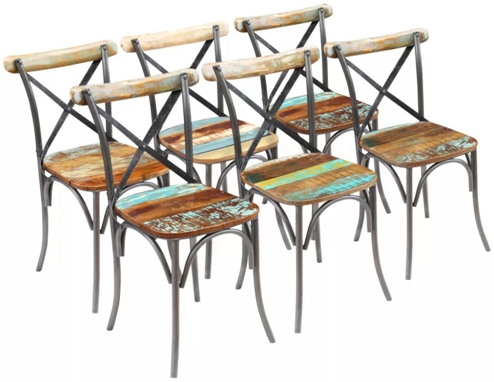 Die vidaXL Esszimmerstühle 6 Stk. Altholz Massiv [274396] sind aus recyceltem Massivholz gefertigt und bieten einen einzigartigen Vintage-Look. Jeder handgefertigte Stuhl ist ein Unikat mit kleinen Unvollkommenheiten, die seine Individualität betonen. Das stabile Stahlgestell sorgt für Robustheit. Die Maße betragen 51 x 52 x 84 cm (B x T x H), mit einer Sitzbreite von 41 cm, einer Sitztiefe von 42 cm und einer Sitzhöhe vom Boden von 48 cm. **Highlights** - Einzigartiger Vintage-Stil: Jeder Stuhl ist aus Altholz gefertigt und ein Unikat. - Stahlgestell für Stabilität und Robustheit. - Handgefertigt mit Liebe zum Detail. - Offene, gekreuzte Rückenlehne für Retro-Look. - Mehrfarbiger Anstrich verleiht jedem Stuhl Charakter. **Produkteigenschaften** - Recyceltes Massivholz + Stahlgestell - Maße: 51 x 52 x 84 cm (B x T x H) - Sitzbreite: 41 cm, Sitztiefe: 42 cm, Sitzhöhe vom Boden: 48 cm - Jeder Stuhl ist ein Unikat mit kleinen Unvollkommenheiten - Retro-Farbanstrich für individuellen Charakter **Lieferumfang** - 6 Esszimmerstühle