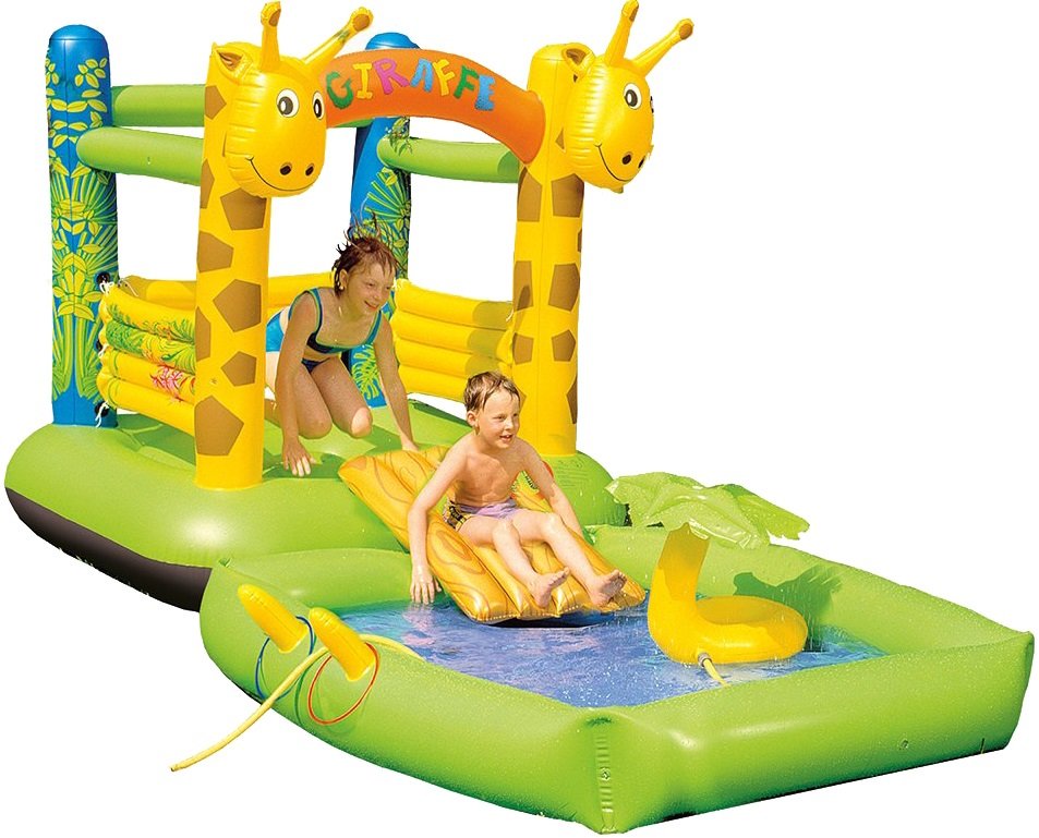 **Der Sommer ist da!** Der Planschspaß ist mit diesem Wasserspielzeug vorprogrammiert! Die Kids können auf der farbenfrohen Giraffen-Hüpfburg springen bis sie ausgepowert sind und anschließend ins kühle Nass rutschen. Im Becken können sie planschen und sich von der Sprühpalme erfrischen lassen. **Hüpfburg und Planschspaß in Einem!** Die Hüpfburg und der Spielpool sind mit drei Seitenteilen und abnehmbaren Giraffenköpfen ausgestattet. Der Pool hat ein Bodenablassventil und kann auch separat nur als Planschbecken genutzt werden. Eine Rutsche verbindet die kinderfreundliche Hüpfburg mit dem erfrischenden Planschbecken. Im Pool kann außerdem eine aufblasbare Sprühpalme angeschlossen werden, um für noch mehr Planschspaß zu sorgen. **Weitere Details:** - 2 in 1 Hüpfburg mit separatem Pool - abnehmbare Rutsche - aufblasbare Palme mit Sprühfunktion - mit handelsüblichen Gartenschlauchanschluss - Maße: - Hüpfburg ca.165 x 165x 175cm - Pool ca. 195 x 142 cm - 3 Seitenteile - abnehmbare Rutsche - zwei Wurfringe Achtung: Die maximal empfohlene Personenzahl nicht überschreiten. Die empfohlene Höchstlast nie überschreiten. Die beiliegende Bedienungsanleitung lesen und beachten. Achtung: Nicht geeignet für Kinder unter 6 Jahren. Benutzung unter Aufsicht von Erwachsenen.