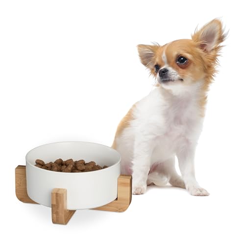 - Der Fressnapf aus Keramik ist auf einem Gestell aus Bambus platziert, was eine erhöhte Positionierung ermöglicht und somit den Nacken des Hundes schont