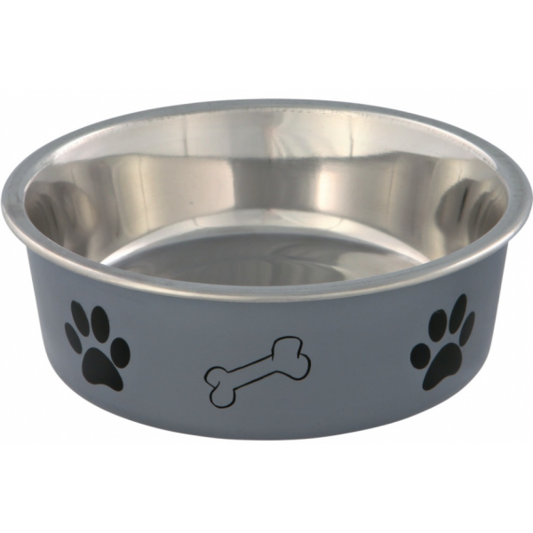 - Der Trixie Edelstahlnapf mit Kunststoffmantel hat ein ansprechendes Design mit einem hübschen Pfotenmotiv.