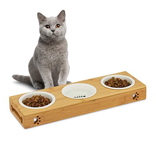 Relaxdaysnatur 3er Napfständer Bambus, Keramikschalen Wasser & Futter, spülmaschinenfest, Napfbar Katzen, kleine Hunde, L