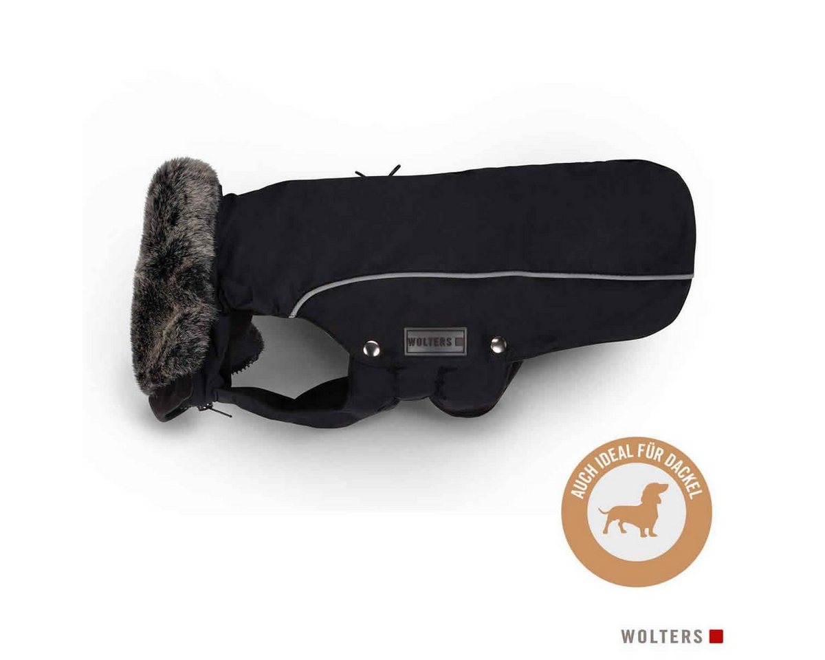 Wolters Hundemantel Winterjacke Amundsen für Dackel schwarzmit Kunstpelzkragen und reflektierend - 100% PFC-frei