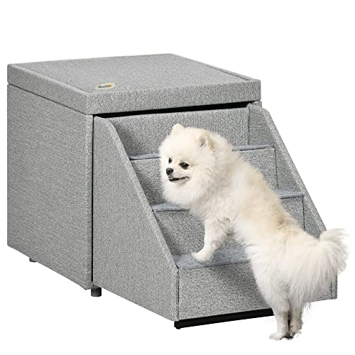 PawHut Hundetreppe 2 in 1 4 Stufige Katzentreppe, Haustiertreppe mit Stauraum, Hocker, Tiertreppe, Haustierrampe, für Sofa, Bett, Polyester, Hellgrau, 84 x 45 x 49 cm