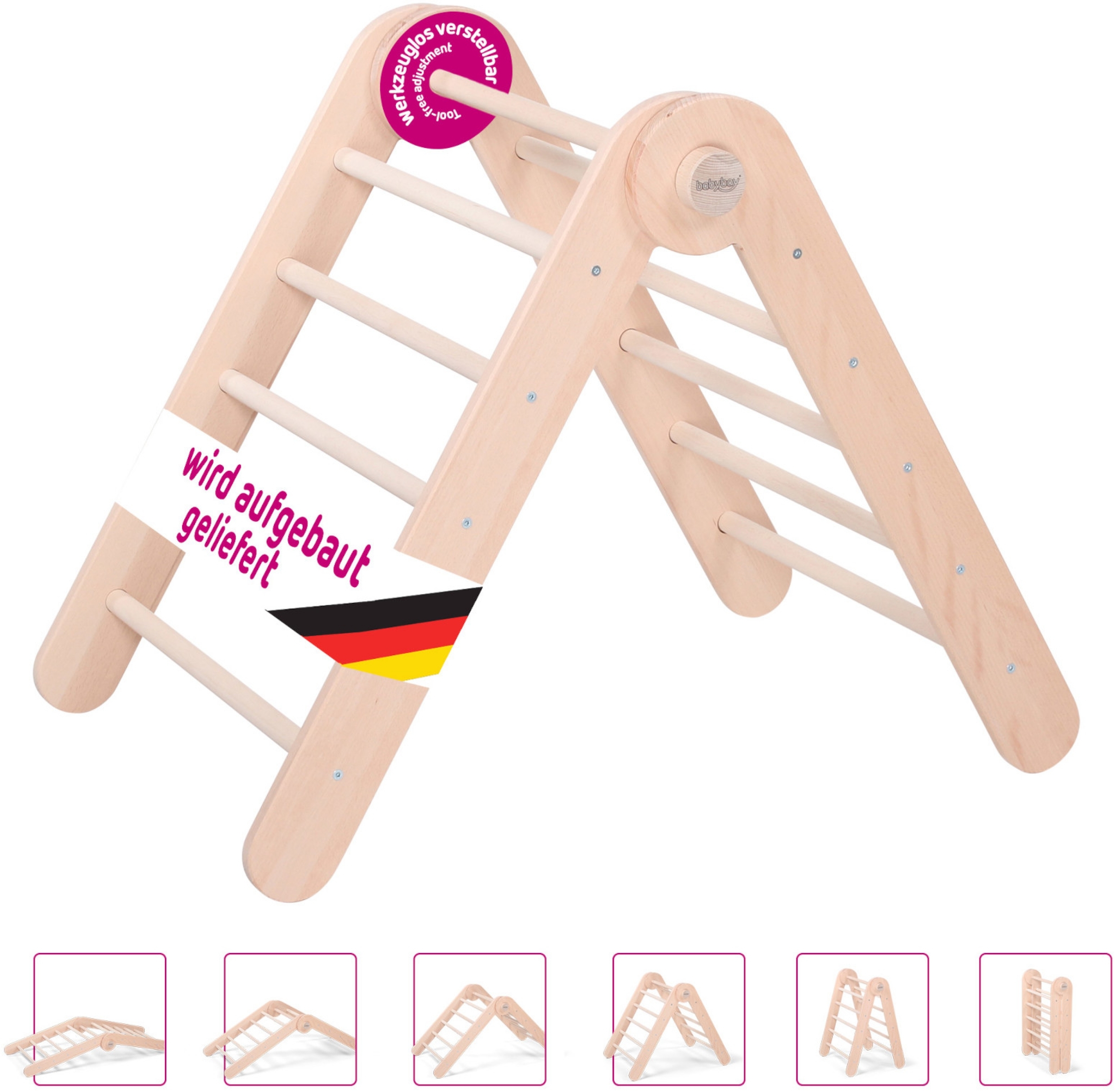 Das babybay Kletterdreieck Littlefoot in natur unbehandelt ist ein einzigartiges Spielgerät, das die motorische Entwicklung Ihres Kindes fördert und gleichzeitig für stundenlangen Spielspaß sorgt. Das Kletterdreieck ist komplett montiert und sofort einsatzbereit. Mit fünf einstellbaren Kletterwinkeln bietet es abwechslungsreiche Herausforderungen für Kleinkinder ab etwa 12 Monaten. Hergestellt aus massivem Buchenholz, garantiert es Stabilität und Sicherheit. **Highlights** - Komplett montiert: Sofort einsatzbereit ohne zusätzlichen Aufbauaufwand - Variabler Spielspaß: Fünf einstellbare Kletterwinkel für unterschiedliche Entwicklungsstufen - Förderung der Motorik: Stärkt das Selbstbewusstsein durch Überwindung verschiedener Kletterhöhen - Sicherer Halt: Unbehandelte Buchenstäbe für optimalen Griff und maximale Stabilität - Platzsparend und erweiterbar: Lässt sich zusammenklappen und verstauen **Produkteigenschaften** - Maße (HxBxL) eingeklappt: 81,30 x 18,20 x 60,60 cm - Altersempfehlung: Ab ca. 12 Monaten - Maximale Belastbarkeit: 100 kg - Material: Vollholz Buche - Anzahl verschiedene Kletterwinkel: 5 **Lieferumfang** - 1 x babybay Kletterdreieck Littlefoot natur unbehandelt - Zubehör und Dekorationen sind nicht Teil des Lieferumfangs