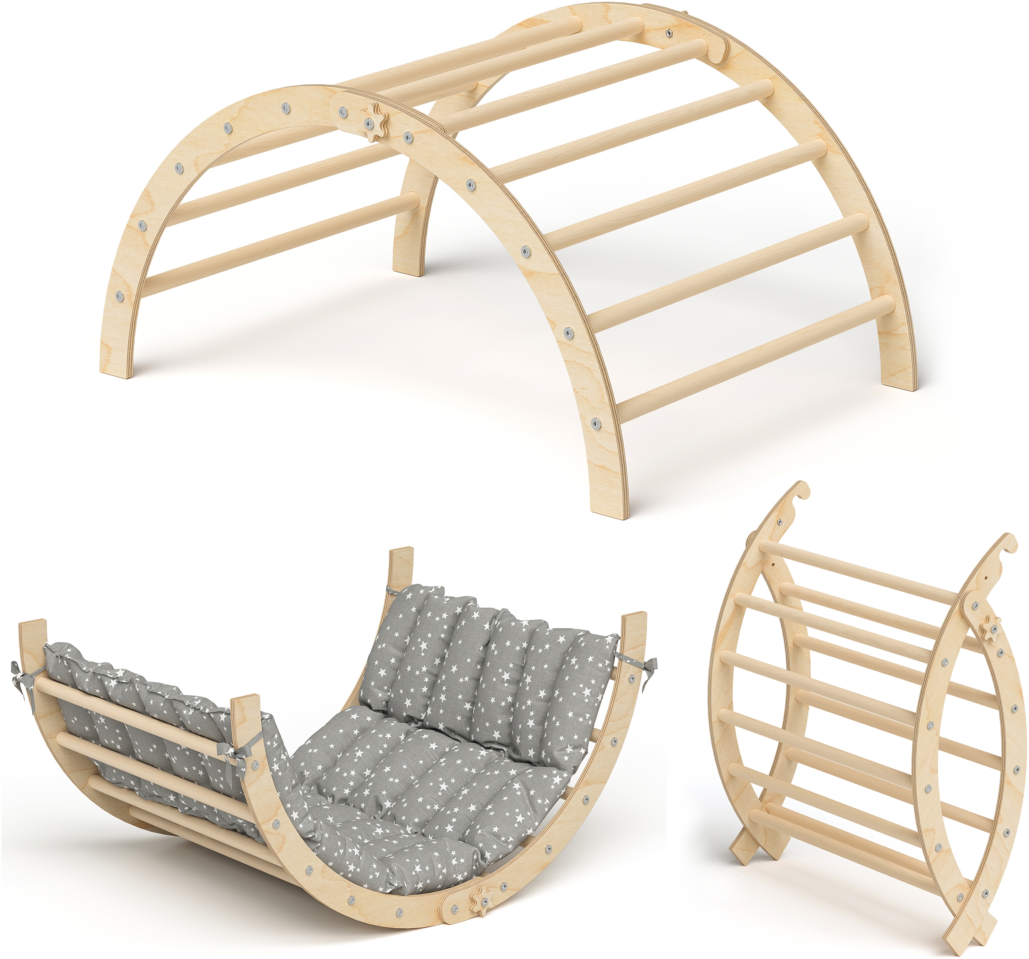 Bellabino 'Ruki' 2in1 Kletterbogen und Wippe zusammenklappbarinkl. Matratze 'Weiße Sterne', natur lackiert, Buche Massivholz