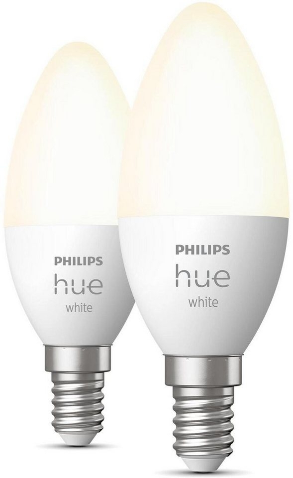 Hue White standard bulb, 5. 5W (40W equivalent), E14 socket, B39 candle bulb shape, 2700 kelvin, 470 Lumen, up to 25 000 hours lifespan, control with your smart devices by connecting to a Hue Bridge (sold separately) or a Hue Dimmer Switch, voice control with Google Home, Alexa or Siri, 2-Pack.