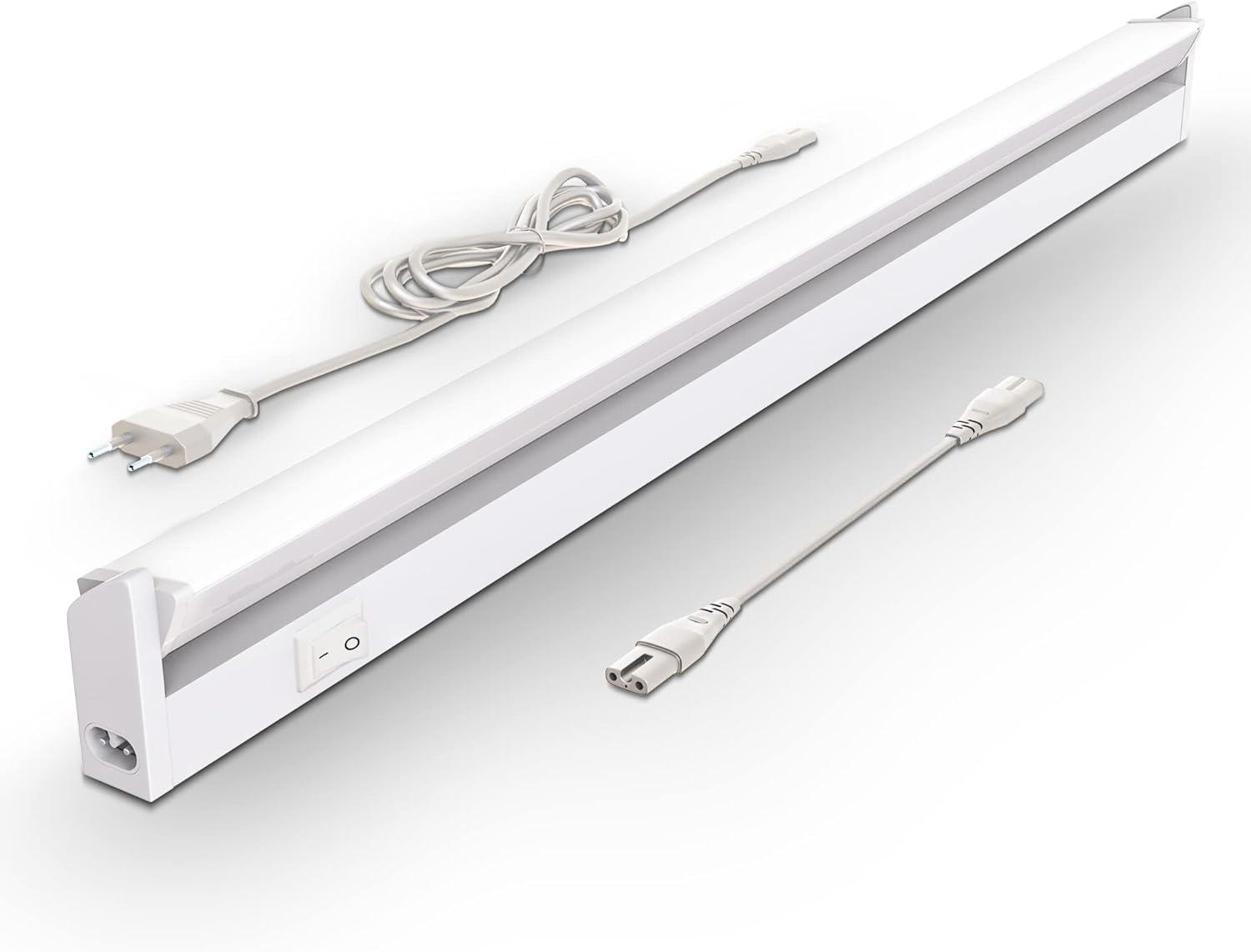 ## B.K.Licht I schwenkbare LED Unterbauleuchte I Lichtleiste I neutralweiße Lichtfarbe 4.000K I 1.000lm I Küchenleiste I Küchenleuchte I Küchenlampe I Schrankleuchte I Schranklampe I Weiß I Länge: 55cm Mit dieser modernen LED Unterbauleuchte lassen sich optimal größere Arbeitsflächen im Küchenbereich ausleuchten. Die Leuchte Maia ist schwenkbar, strahlt in neutralweiß und wird inklusive einer LED Platine geliefert. Zusätzlich umfasst die Lieferung noch eine Zuleitung und ein Verbindungskabel. Mit dem Verbindungskabel können Sie mehrere Unterbauleuchten, z. B. über Eck, verbinden, ohne eine zusätzliche Steckdose zu belegen. * Jeder Bereich wird durch die LED Küchenleuchte mit 1000 Lumen und 8,5 Watt hell erleuchtet. Die Unterbaulampe strahlt mit 4.000 Kelvin neutralweißes Licht aus. * Diese LED Unterbauleuchte ist unter Schränken und über Arbeitsplatten anzubringen. Mittels 1,8m langer Zuleitung und 15cm langen Verbindungskabeln kann die Leuchte flexibel angebracht werden. * Der Ein- und Ausschalter befindet sich linksseitig am Gehäuse. Max. 10 LED Leisten lassen sich unter Zuhilfenahme eines 15cm Verbindungskabels nebeneinander Verbinden. Mit einer Größe von 547 x 61 x 24 mm (LxBxH) ist sie unauffällig und leistungsstark. * Die Unterschrankleuchte ist schwenkbar und leuchtet so jede Richtung gut aus * Bei diesem Produkt handelt es sich um ein umgebendes Produkt. Umgebende Produkte sind Leuchten, die zur separaten Überprüfung der enthaltenen Lichtquelle(n) zerlegt werden können ### Technische Daten der Leuchte: * Leuchmittel: LED Modul 8.5 Watt * Farbtemperatur: 4.000 Kelvin (neutralweiß) * Lichtleistung: 1.000 Lumen * Lebensdauer ca.: 20.000 Stunden * Schutzart IP20 * Schutzklasse II * Spannung: 230 Volt * Länge Zuleitung: 1.800 mm * Länge Verbindungskabel ca.: 15 cm * Material: Kunststoff * Farbe: Titan oder weiß * Schwenkbar um ca. 45 Grad * Abmessungen (BxTxH): 550 x 61 x 24 mm ### Lieferumfang: * 1x Unterbauleuchte * 1x Anschlusskabel * 1x Verbindungskabel * 1x Montageset ### **Information zum ElektroG3:** Wir möchten Sie darauf hinweisen, dass Sie als privater Haushalt nach dem Elektro G3 Gesetz, durch die Bestellung dieses Artikels, die Möglichkeit zur Rücksendung eines vorhandenen Altgerätes der gleichen Kategorie haben. Zulässig für die Altgeräterücknahme sind Leuchten, bei denen ein der äußeren Abmessungen mehr als 50 Zentimeter beträgt. Damit wir eine Abholung bei Ihnen vor Ort beauftragen können, wenden Sie sich einfach mit dem Betreff ",Rückgabe Altgerät nach ElektroG3", an unseren Kundenservice.