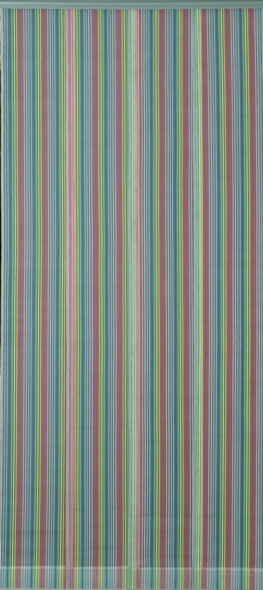 - Der Türvorhang Moskito Fresh besteht aus vier Polyester-Gitter-Bahnen in Grau mit bunten Streifen.