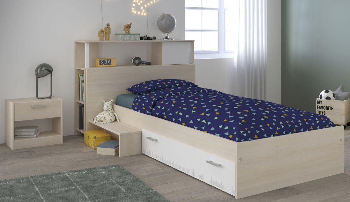 Produktinformationen "Funktionsbett Charly Parisot 90*200 cm inkl. Kopfteil + Ablagetisch + Nachtkommode Das Funktionsbett Charly von Parisot ist die optimale Lösung als Schlafgelegenheit und bietet viele Stauraummöglichkeiten. Darüber hinaus bietet das Bett neben der schönen Optik auch eine stabile Konstruktion und wird somit zu einem Qualitätsmöbel von Parisot. Der Bettkasten unter dem Bett, das Regal links neben dem Bettkasten, die Nachtkommode mit einer Schublade und das Anstellregal hinter dem Bett gehören zum Lieferumfang! Wann holen Sie sich diese tollen Kindermöbel nach Hause? Produktbeschreibung: Material: Holznachbildung Farbe: Akazie / weiß inklusive Anstellregal (als Kopfteil) mit vielen Fächern + 1 Fach mit Tür inklusive 1 Bettkasten auf 4 Rollen mit 2 Griffen inklusive seitliche Abstellfläche (links neben dem Bettkasten) inklusive Nachtkommode mit 1 Schublade auf leichtlaufenden, wartungsfreien Metallschienen + 1 offenes Fach ohne Matratze, Lattenrahmen stabile und gute Verarbeitung Gesamtmaße Bett + Regal (hinter dem Bett als Kopfteil): Breite: 232 cm Höhe: 93 cm Tiefe: 123 cm Bett: Matratzenmaß: 90 x 200 cm Gesamtlänge: 203 cm Gesamttiefe: 121 cm Gesamthöhe: 67 cm Bettkasten: Breite: 121 cm Höhe: 19 cm Tiefe: 40 cm Regal (hinter dem Bett als Kopfteil): Breite: 123 cm Höhe: 93 cm Tiefe: 29 cm Nachtkommode: Breite: 44 cm Höhe: 40 cm Tiefe: 28 cm Qualitätsmerkmale: PEFC zertifiziert (nachhaltige Waldbewirtschaftung) Hersteller zertifiziert nach ISO 14001 Marke: Parisot Pflegehinweis: die Oberfläche ist wenig pflegebedürftig - einfach mit einem feuchten Tuch abwischen