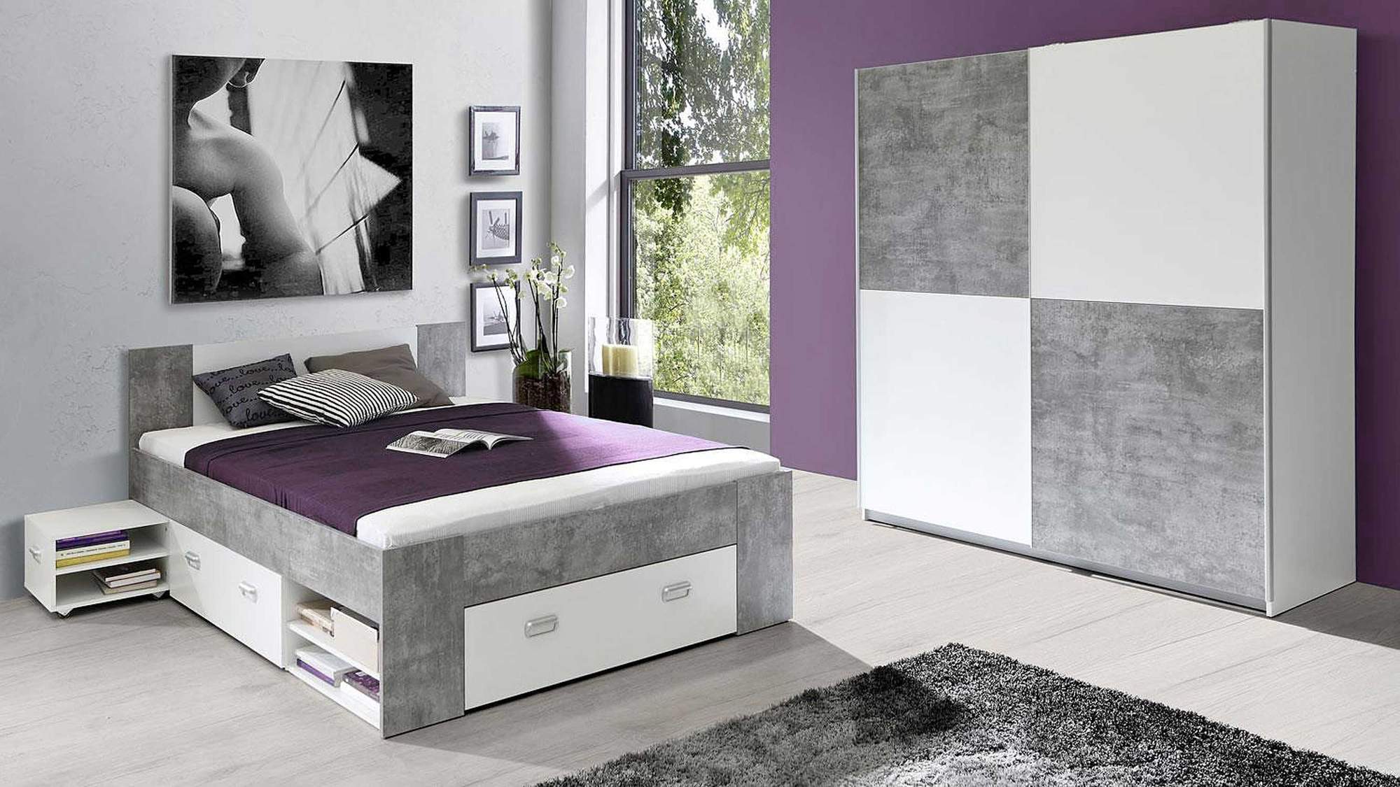 Jugendzimmer WINBOB Bett und Kleiderschrank Weiß Beton Optik, Forte